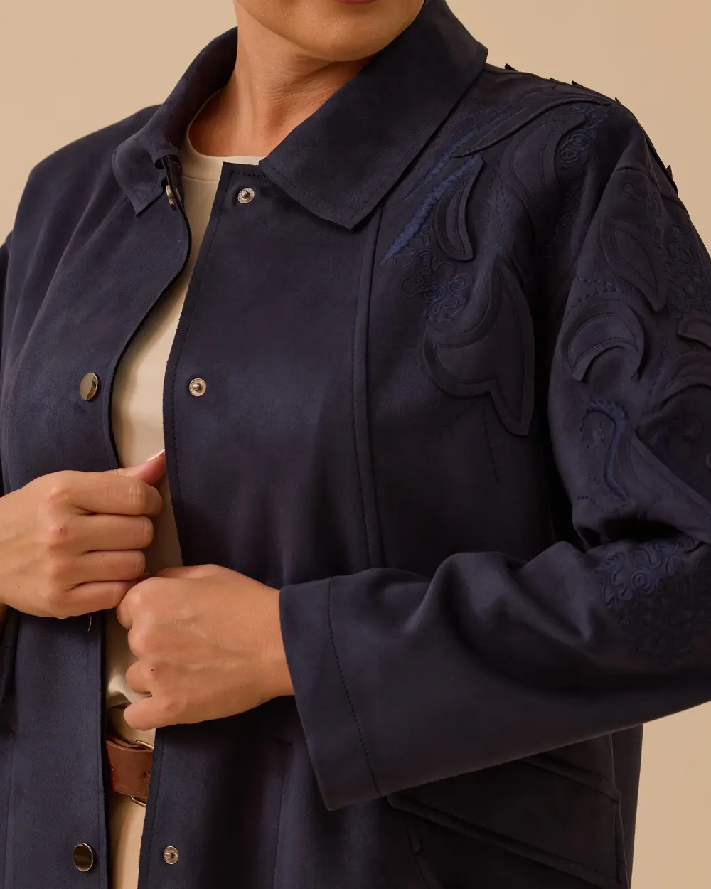 Büyük Beden Gömlek Yaka Çıtçıt Düğmeli Süet Kap, şık gömlek yaka tasarımı ve pratik çıtçıt düğmeleriyle günlük...