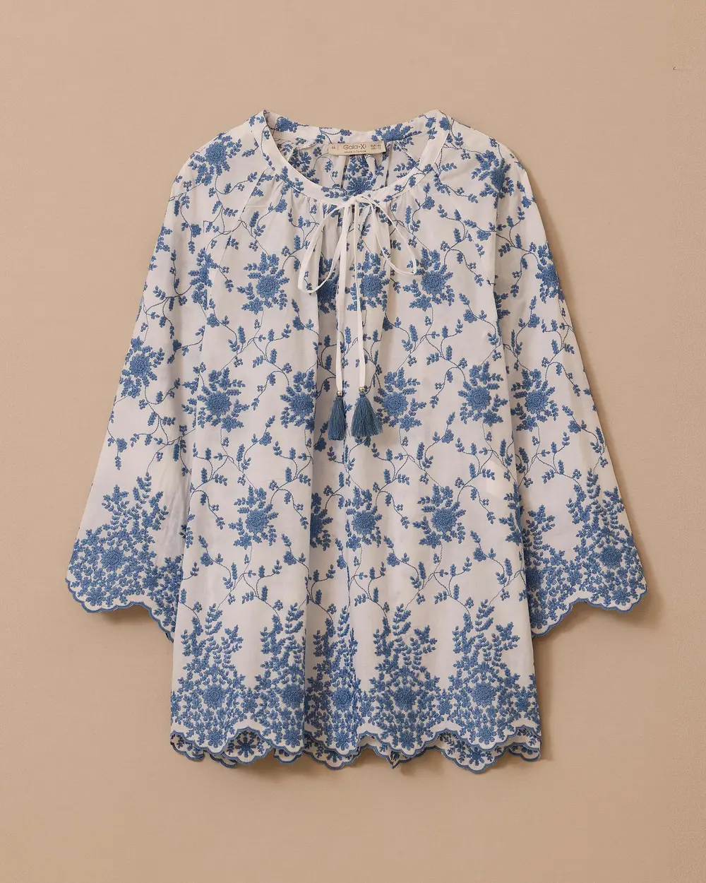 Büyük Beden Püskül Bağlamalı Desenli Bluz, floral desenleriyle enerjik bir stil sunar. Yaka kısmındaki püskül bağlama detayıyla hareket kazanır.