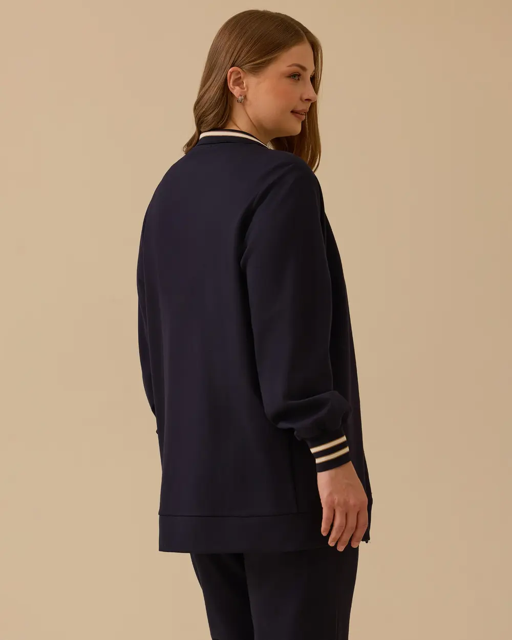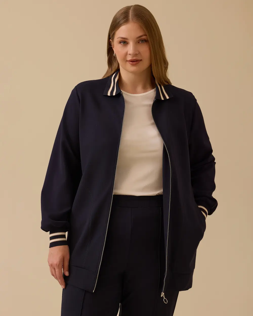Büyük Beden Şerit Detaylı Fermuarlı Ceket, modern şerit detayları ve rahat kesimiyle şıklığı ve konforu bir arada sunar.