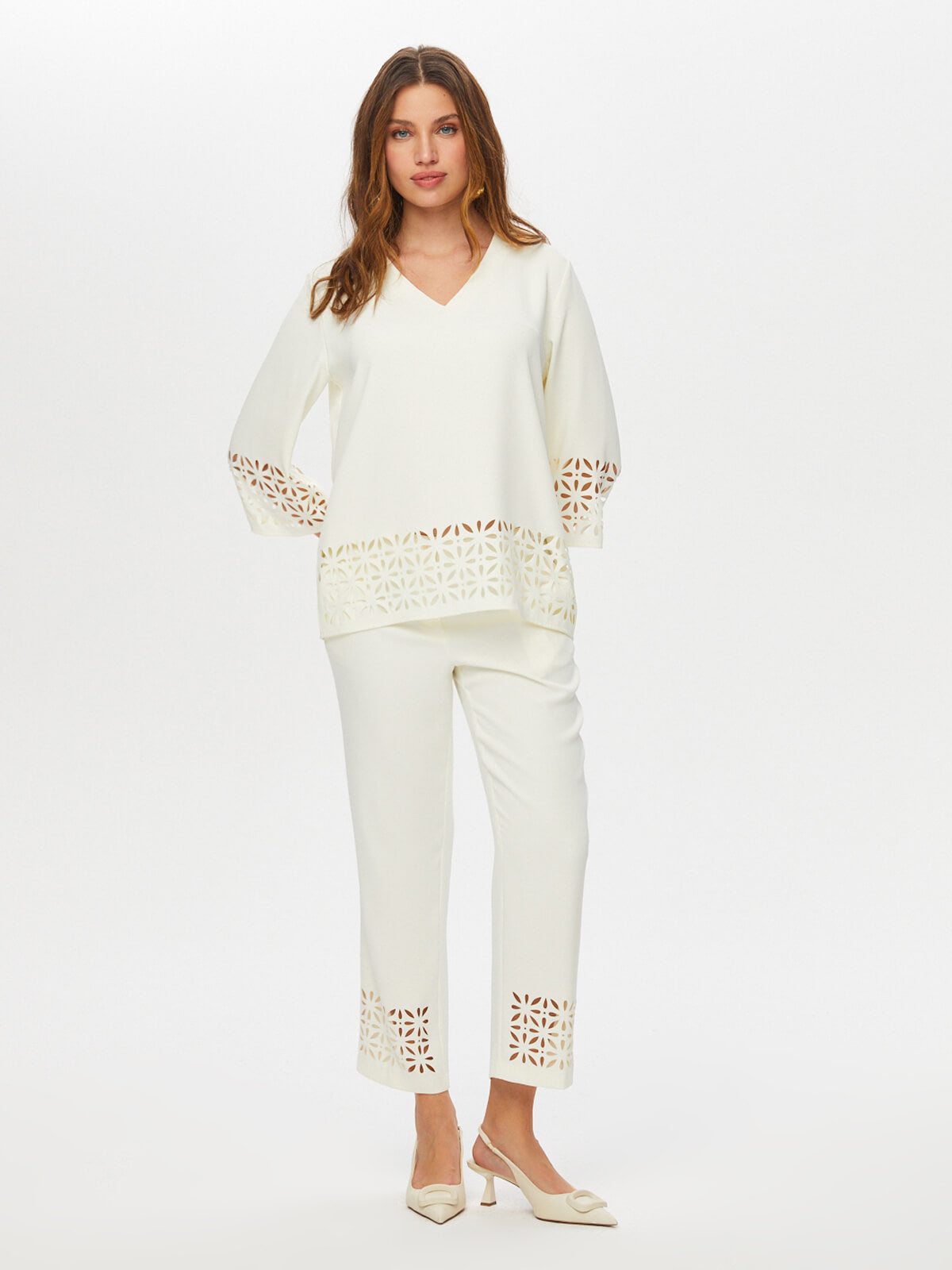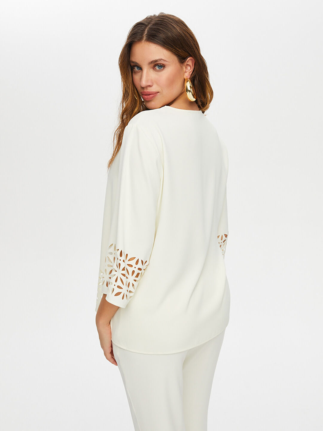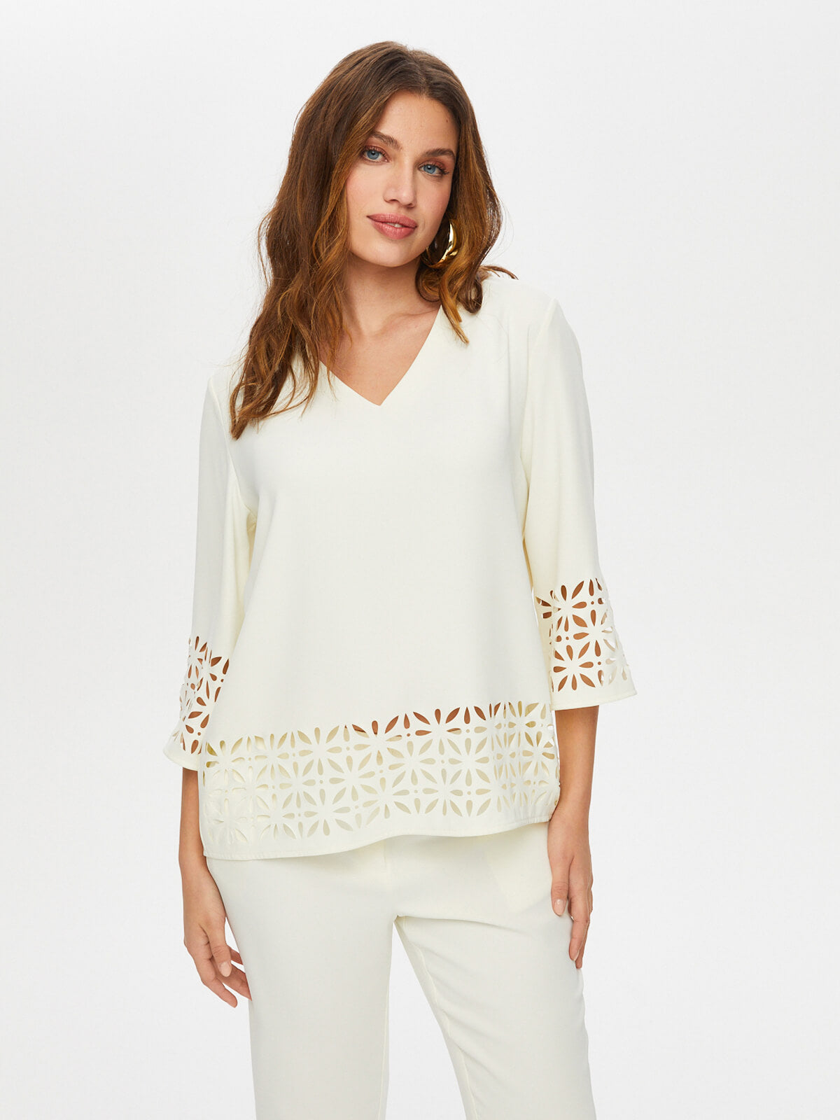 Delik İşi Detaylı V Yaka 3/4 Kol Bluz Bluz Faik Sönmez