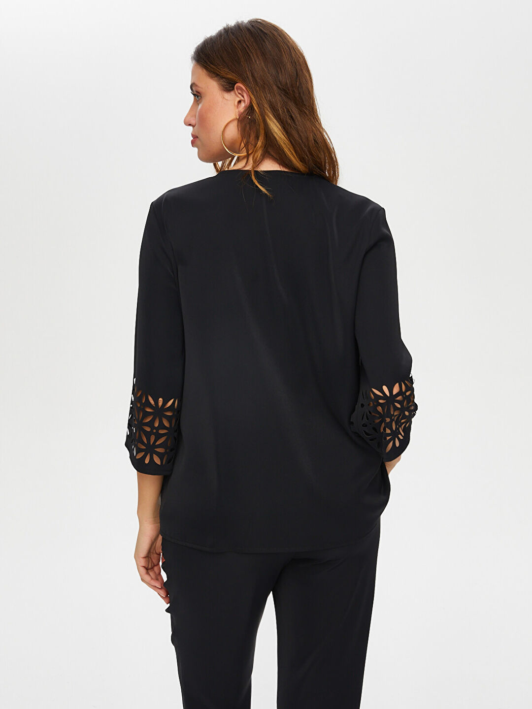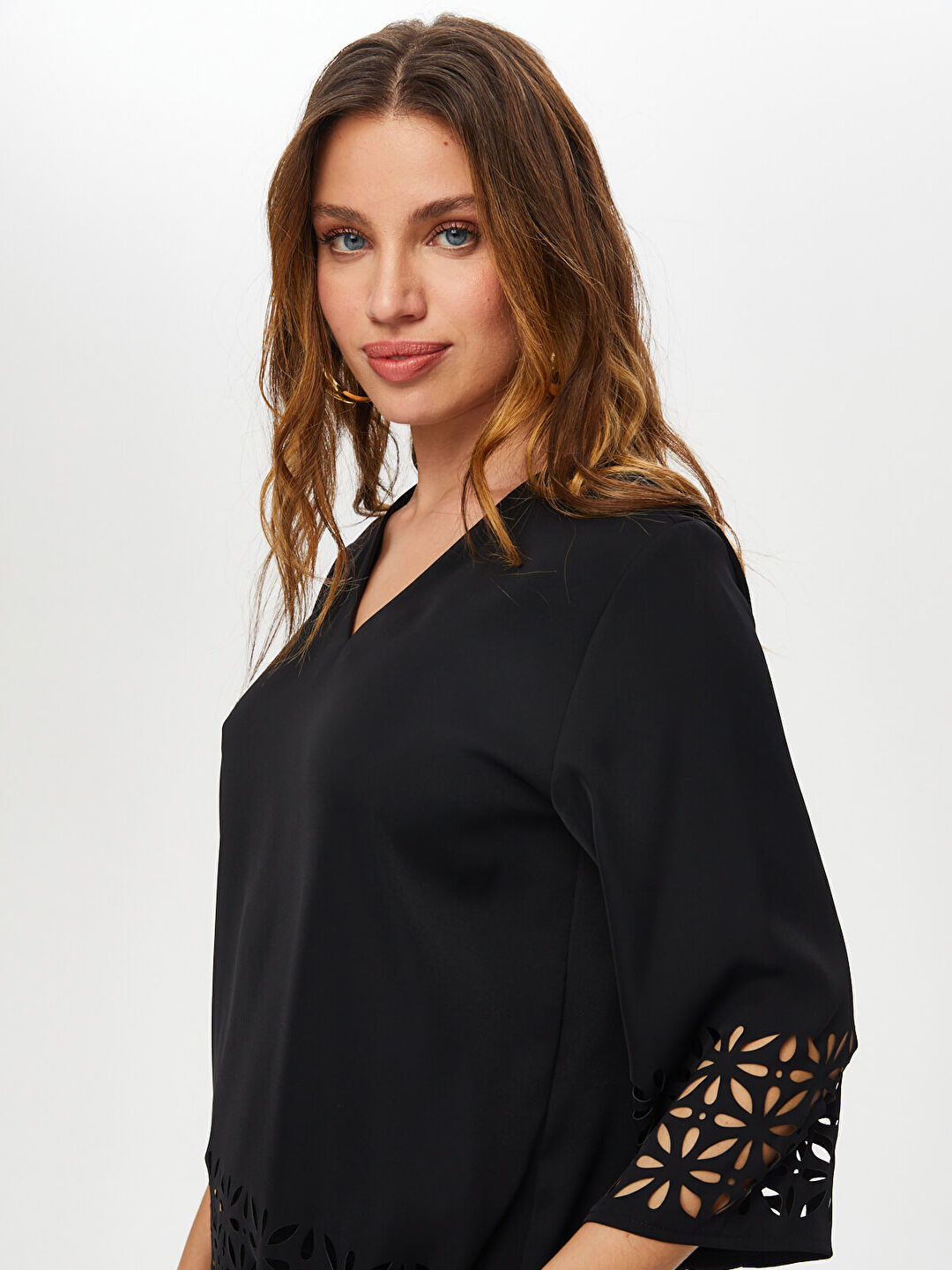 Ürün Adı : Delik İşi Detaylı V Yaka 3/4 Kol Bluz %100 Polyester