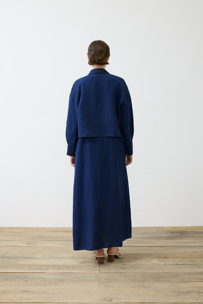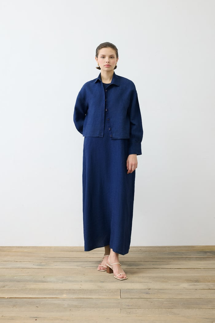Denim Efektli Keten Kolsuz Elbise Gömlek Takım Terzi Dükkani