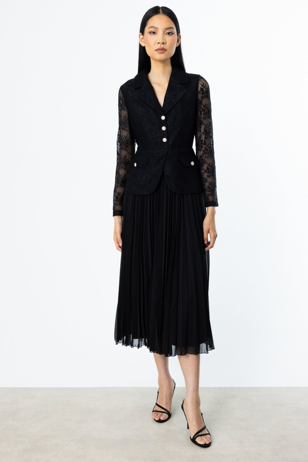Ürün Özellikleri: Etek kısmı piliseli, dantelli, süs düğmeli, süs kapaklı, astarlı, arkadan fermuar kapamalı, maxi boy