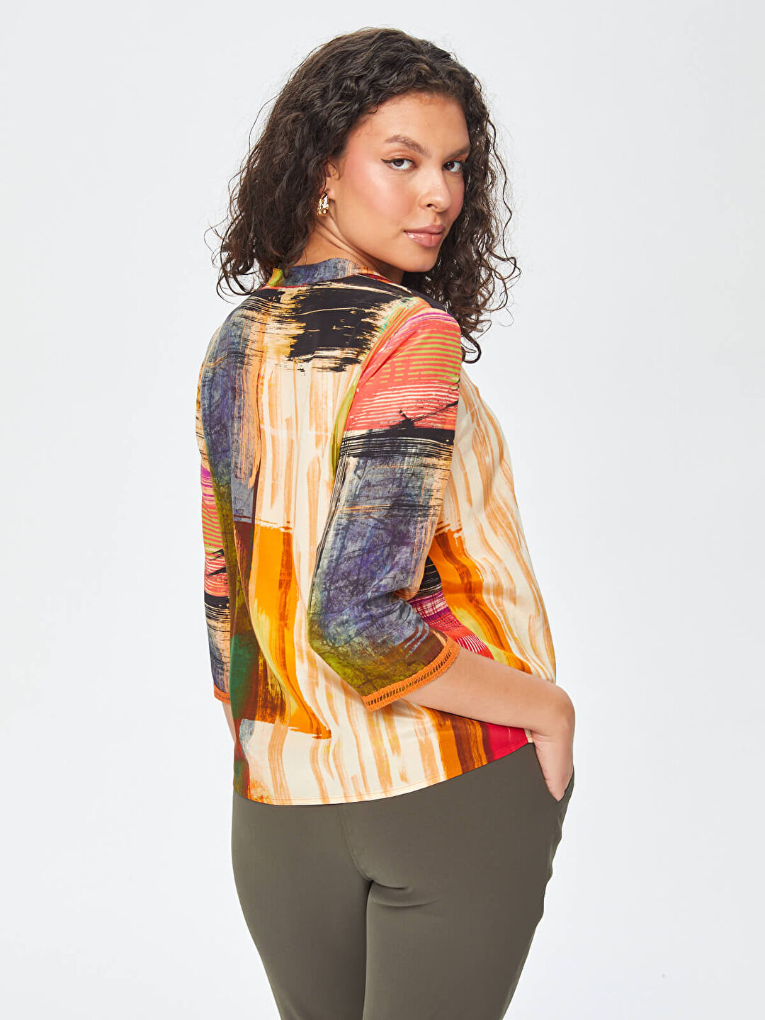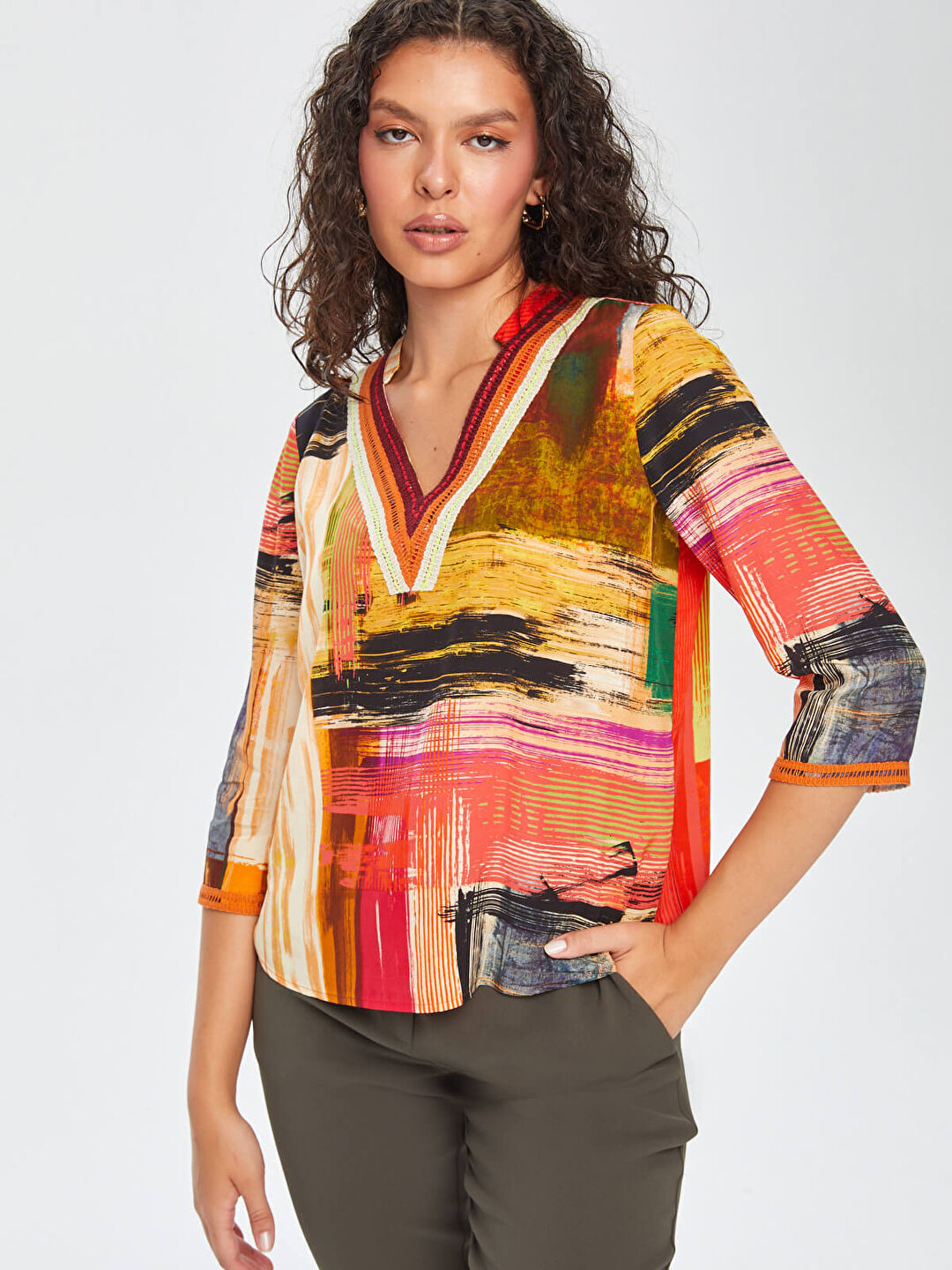 Faik Sönmez Kadın Soyut Desen Şerit Detaylı V Yaka 3/4 Kol  Bluz