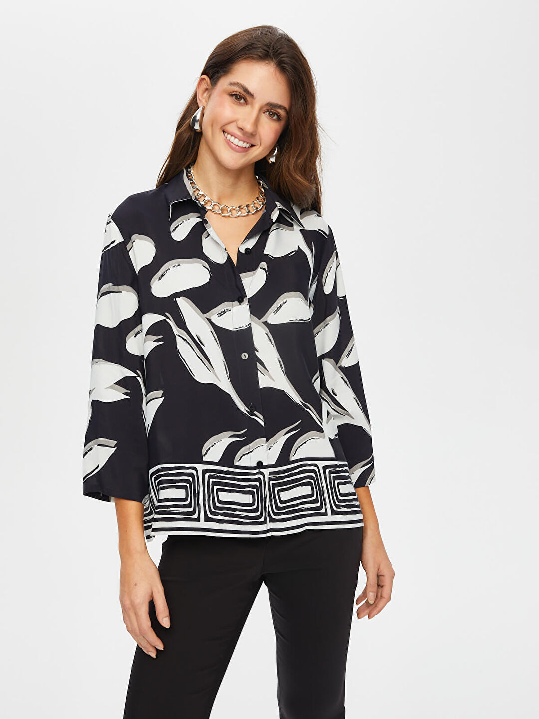 Faik Sönmez Kadın Eteği Sulu Monochrome Yaprak Desen Gömlek%53 Rayon %47 Viskon