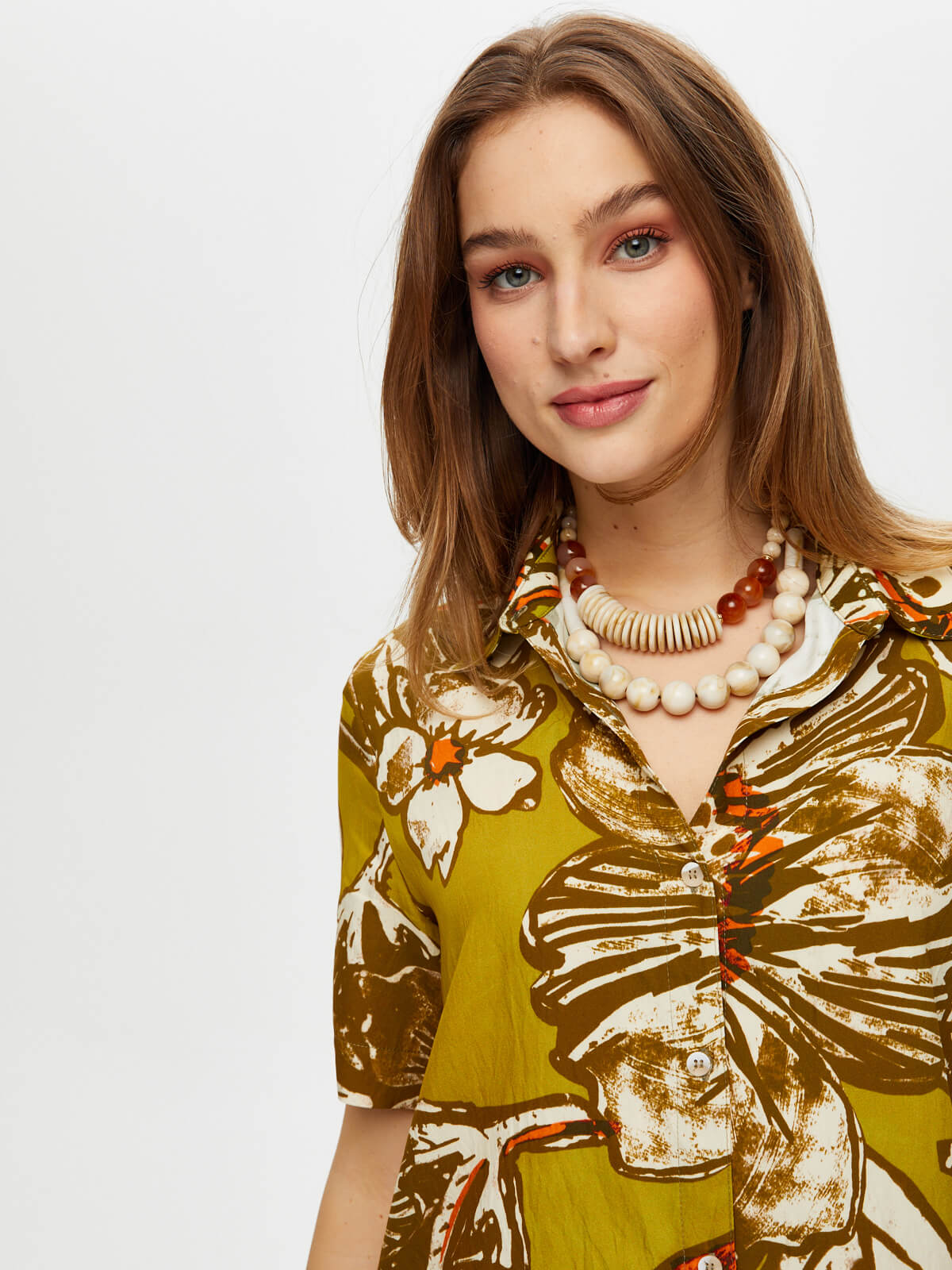 Faik Sönmez Kadın Eteği Sulu Çiçek Desen Kısa Kol Viskon Gömlek