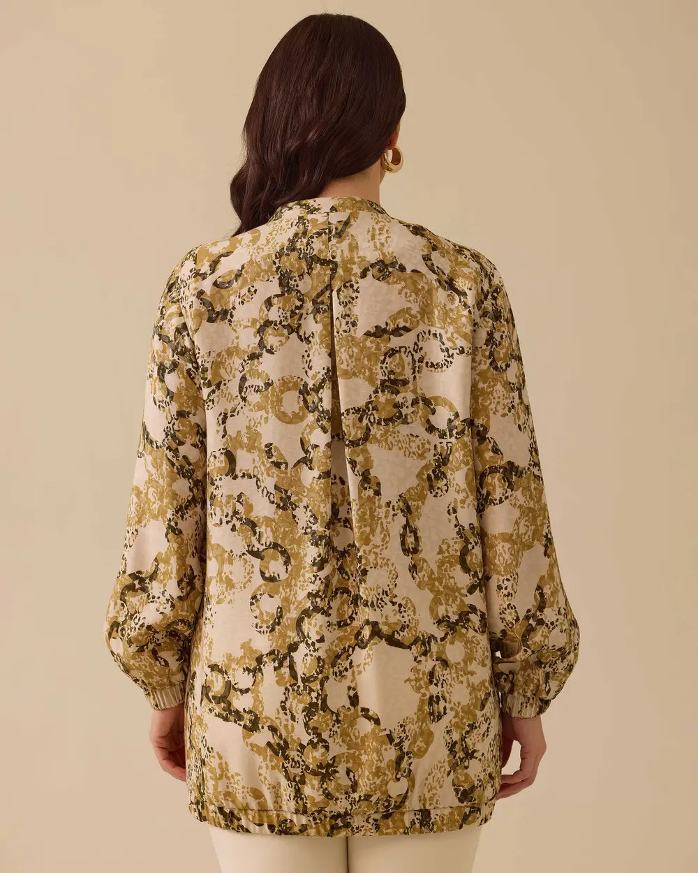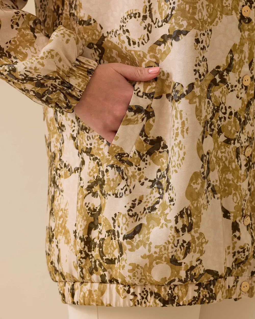 Büyük Beden Desenli Düğmeli Ceket, rahat kesimi ve lastikli etek ucu ile konforlu ve şık bir görünüm sunar.