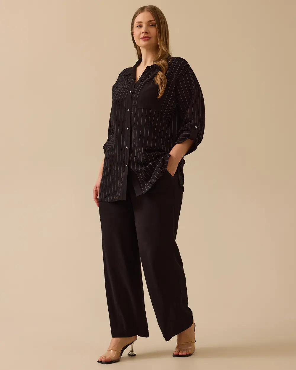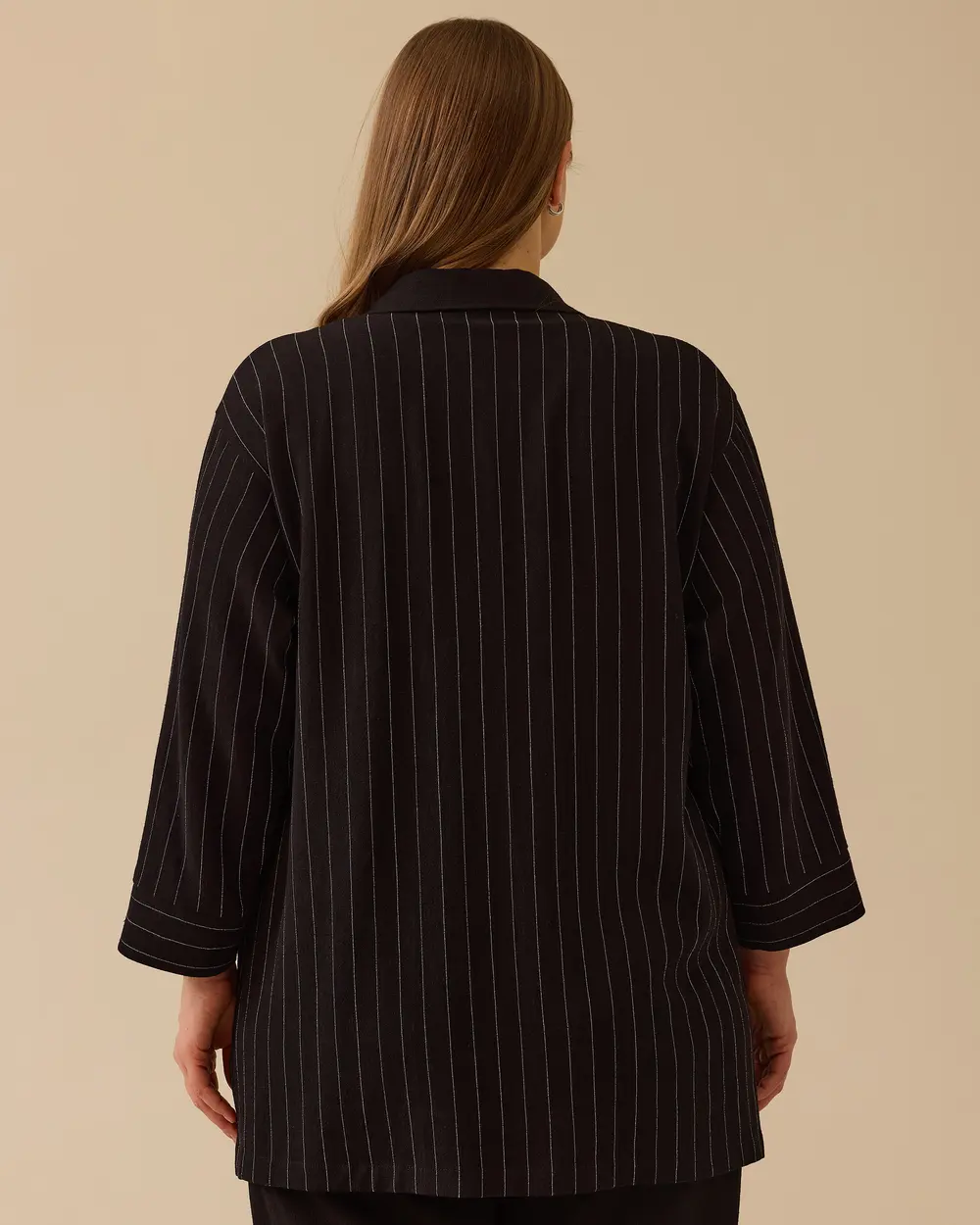 Büyük Beden Çizgili Düğmeli Gömlek, klasik çizgili deseni ve rahat kesimiyle hem günlük hem ofis şıklığı için ideal bir parçadır.