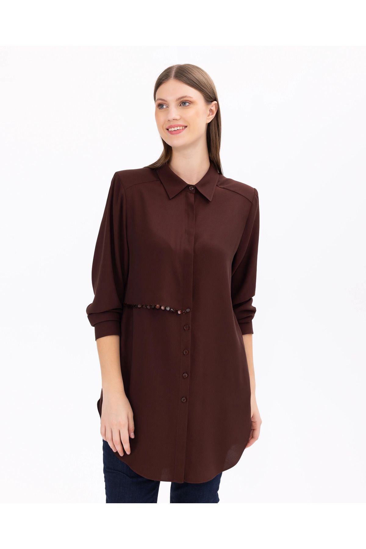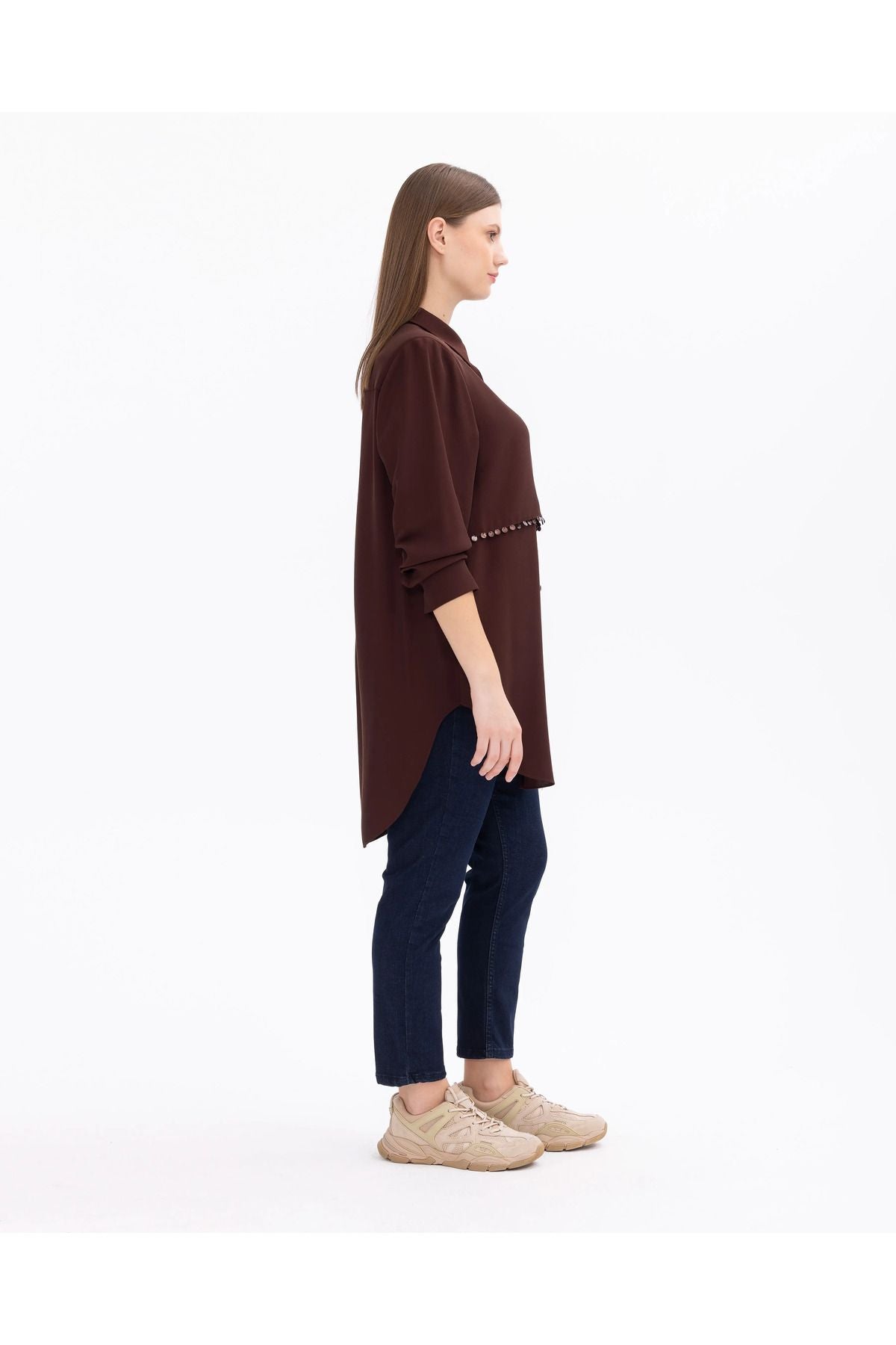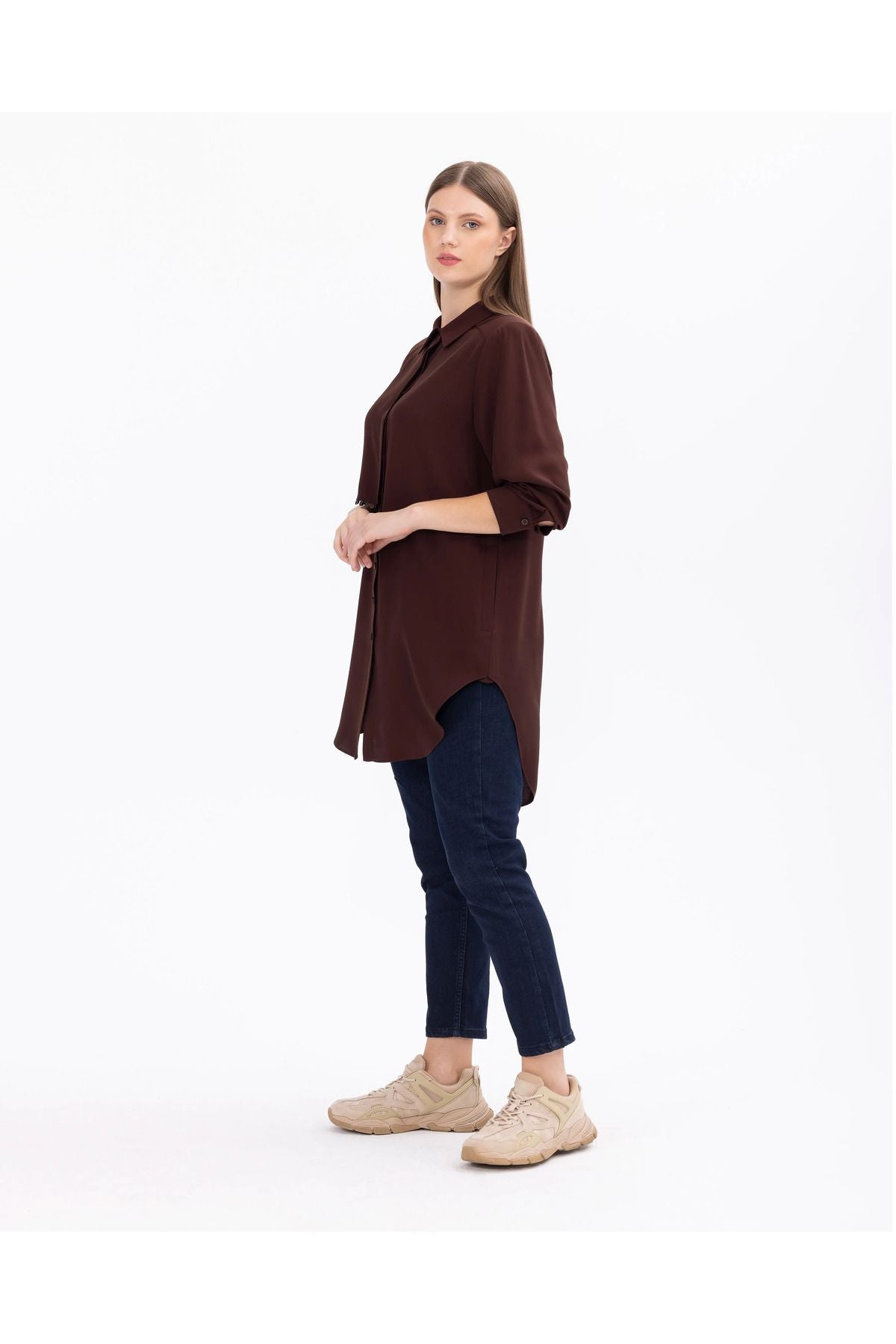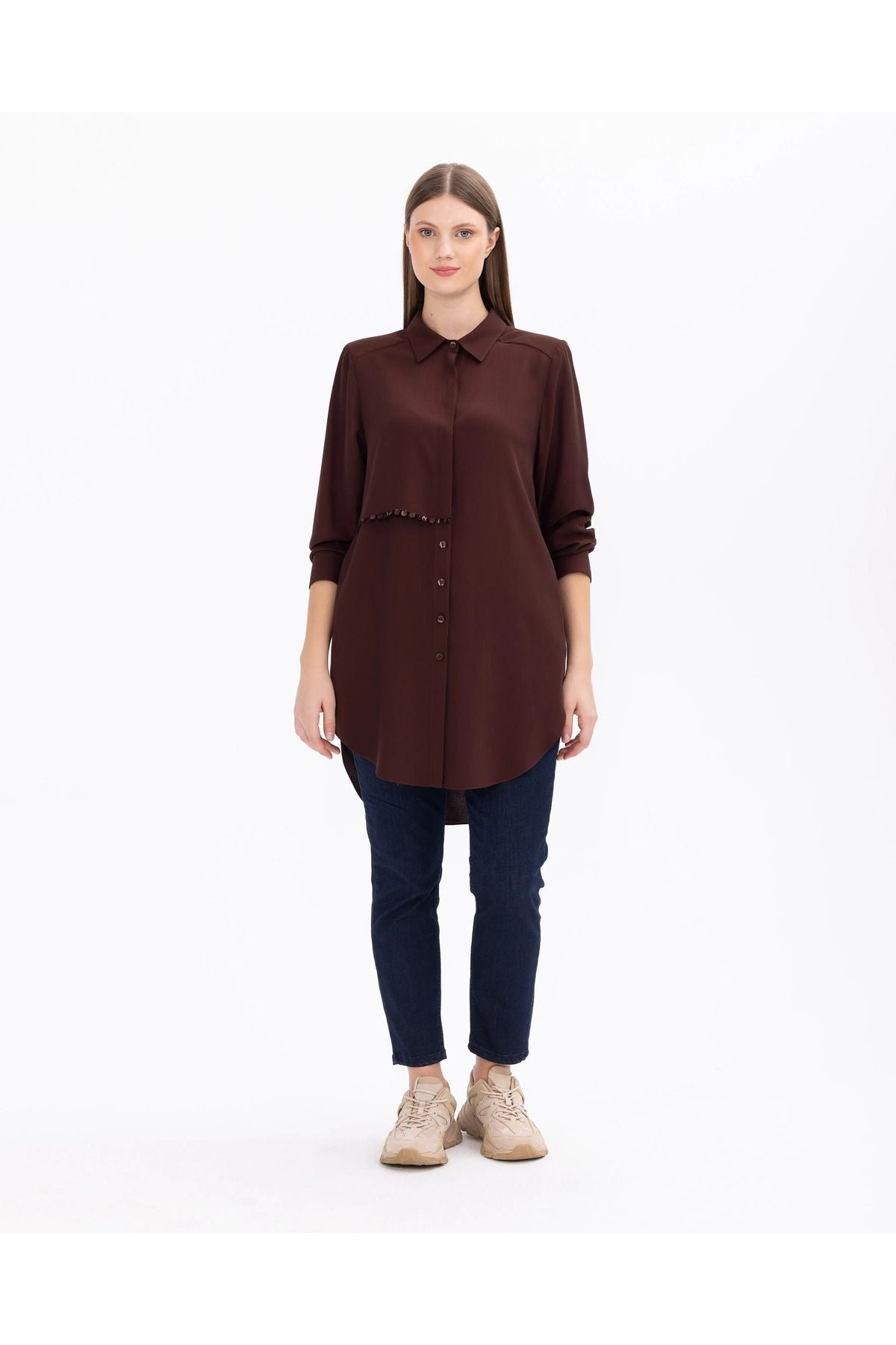Büyük beden uzun kollu gömlek tunik, şıklığı ve konforu bir arada sunan bir parçadır. Rahat kesimi, vücuda mükemmel uyum sağlar ve hareket özgürlüğü sunar. Uzun kollu tasarımı, soğuk havalarda sıcaklık sağlar. Hem günlük kullanıma hem de özel günlerde tercih edebilirsiniz.; Ürün Özellikleri: Uzun Kol; Düğmeli; Gömlek Yaka; Basen Altı Boy; Manşetli; Viskon; Kumaş İçeriği:% 58 Poliester %42 Viskoz; Manken Ölçüleri:; Örnek Beden: 44; Manken Boyu 178; Ölçüler: 97 / 76 / 108;