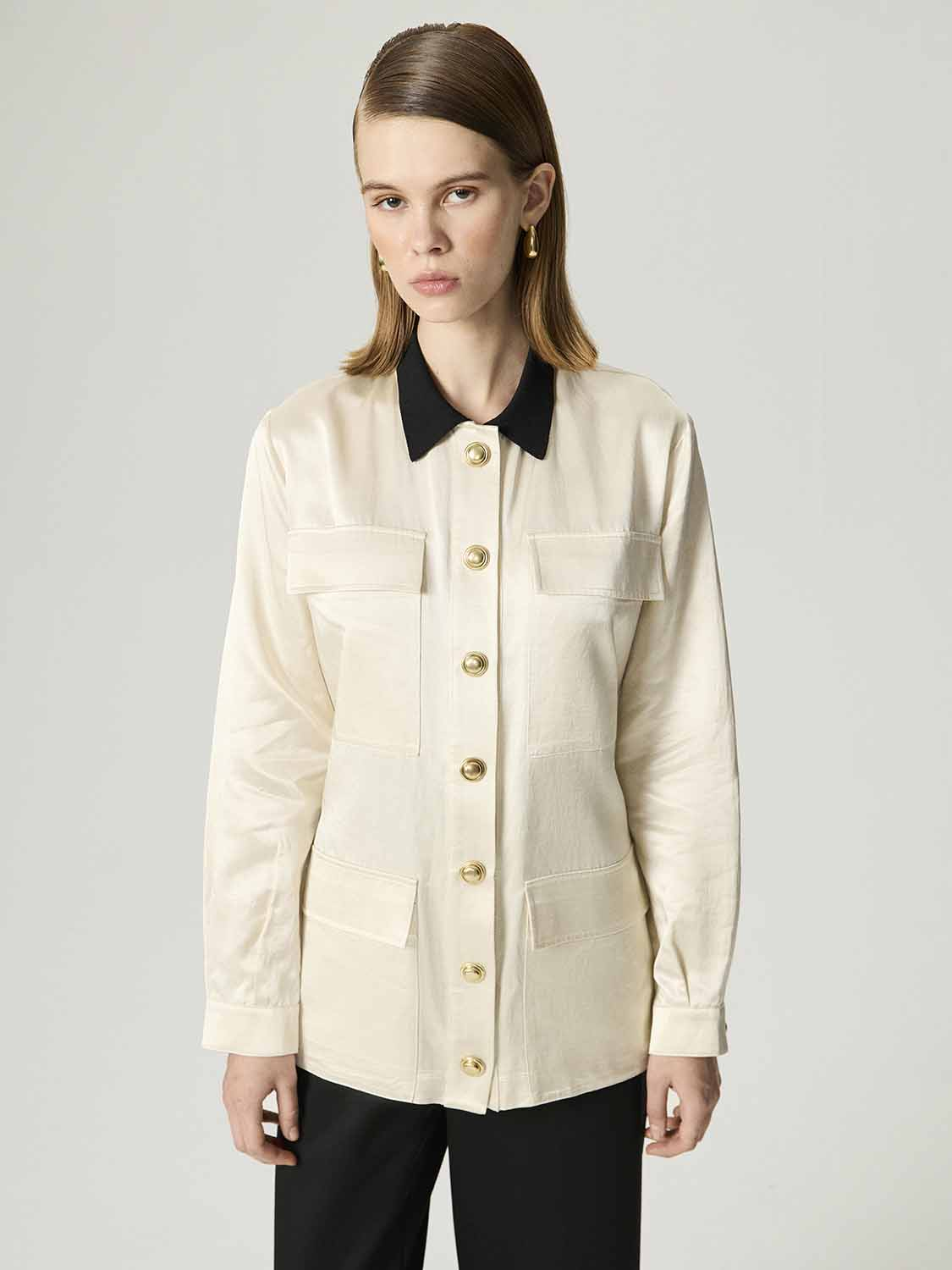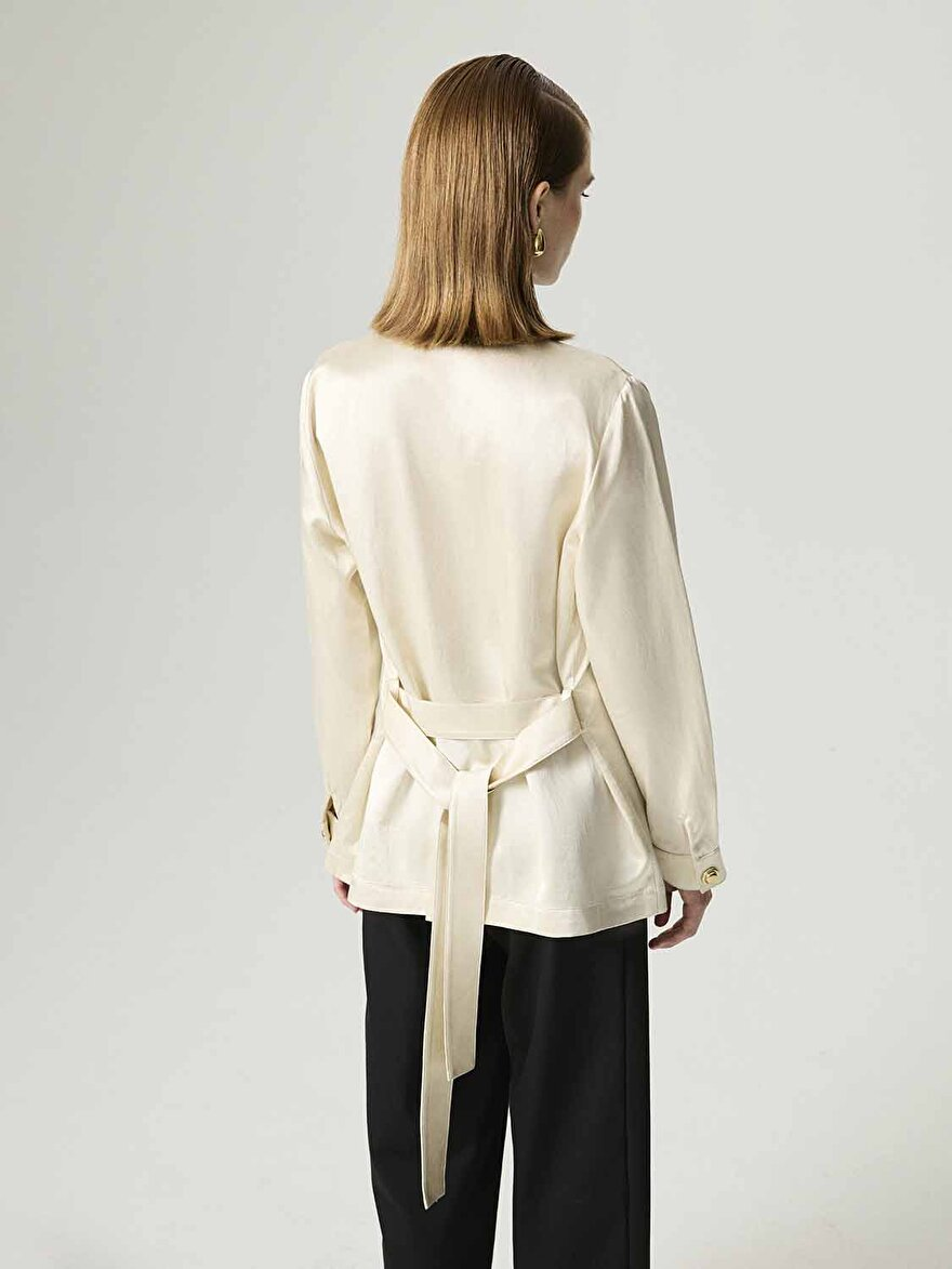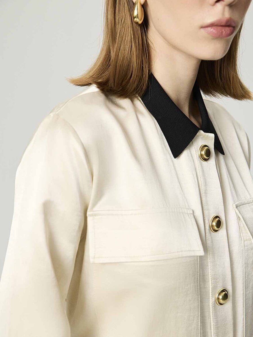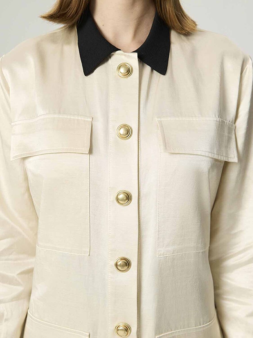 - Ürün Açıklaması: Regular fit, tam kalıp, astarsız, garnili, dokuma, çıtçıt kapamalı, ön cepli, uzun kollu, katlı yaka, gold düğme aksesuarlı ceket