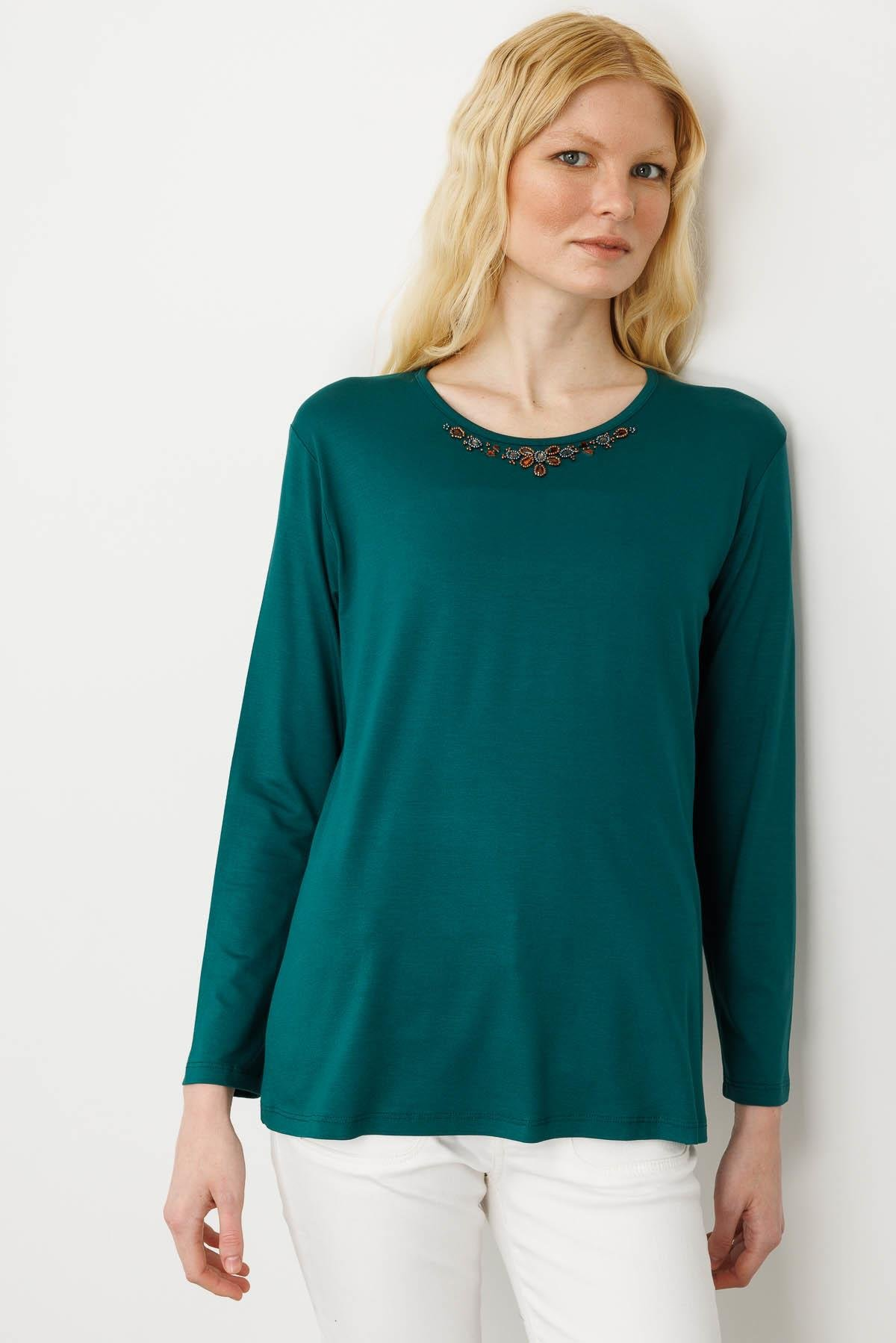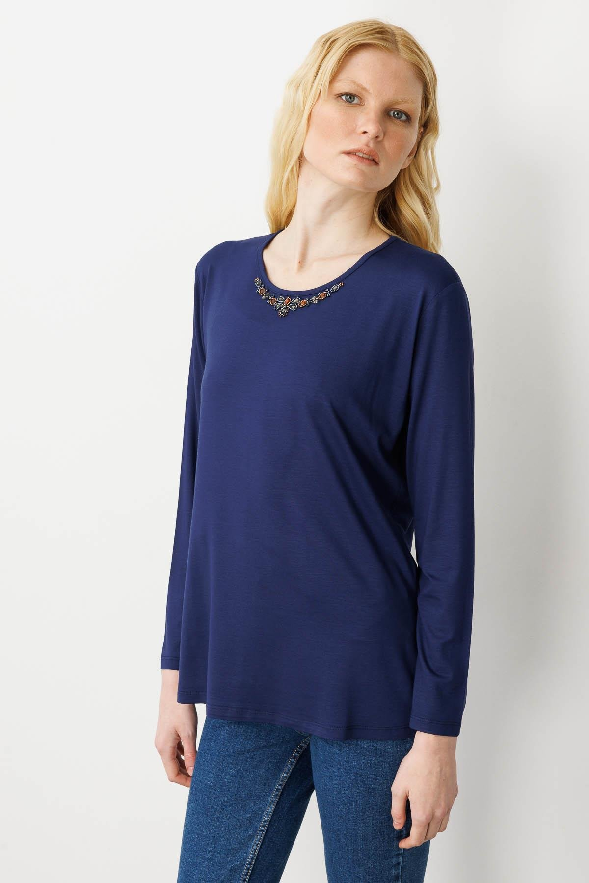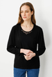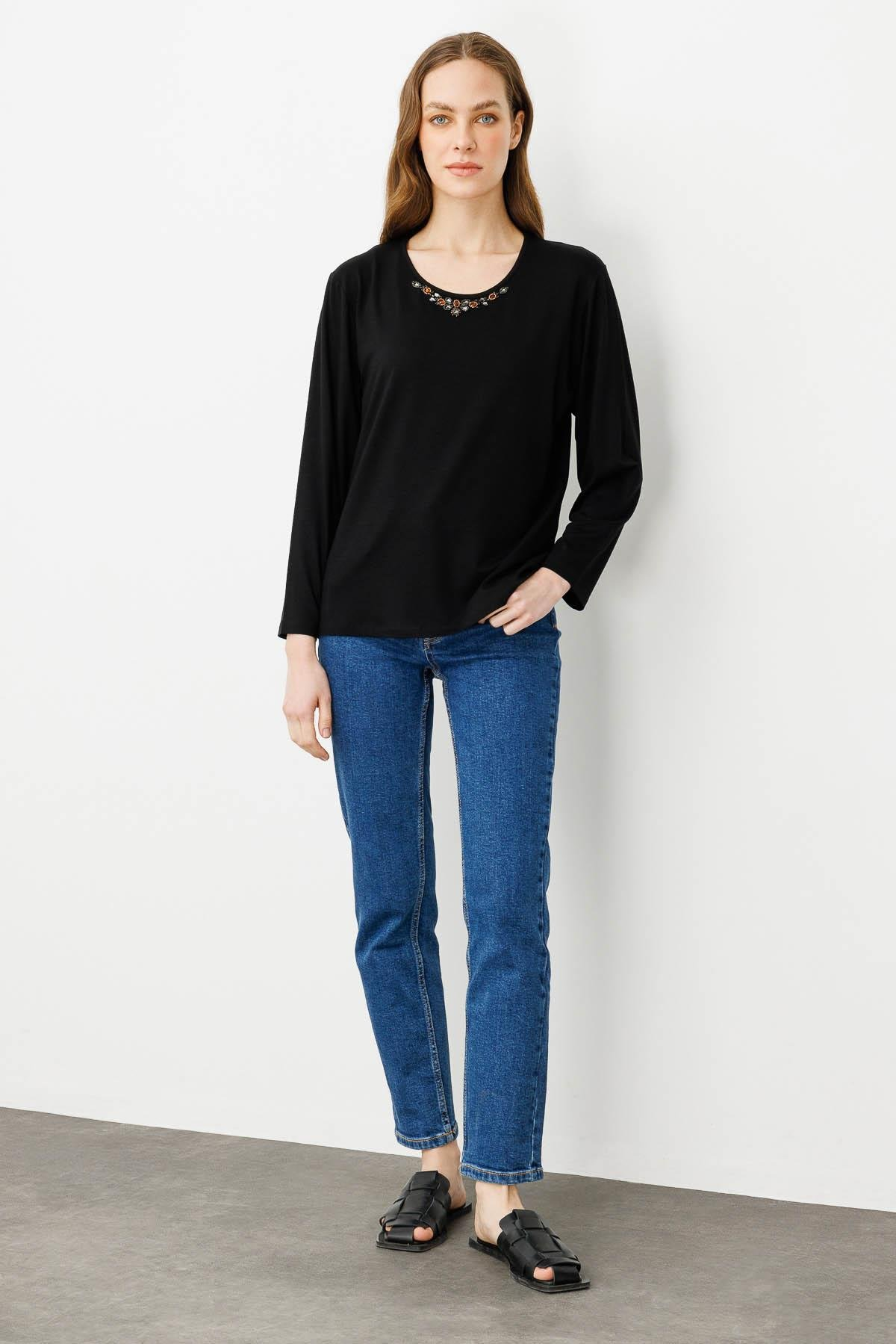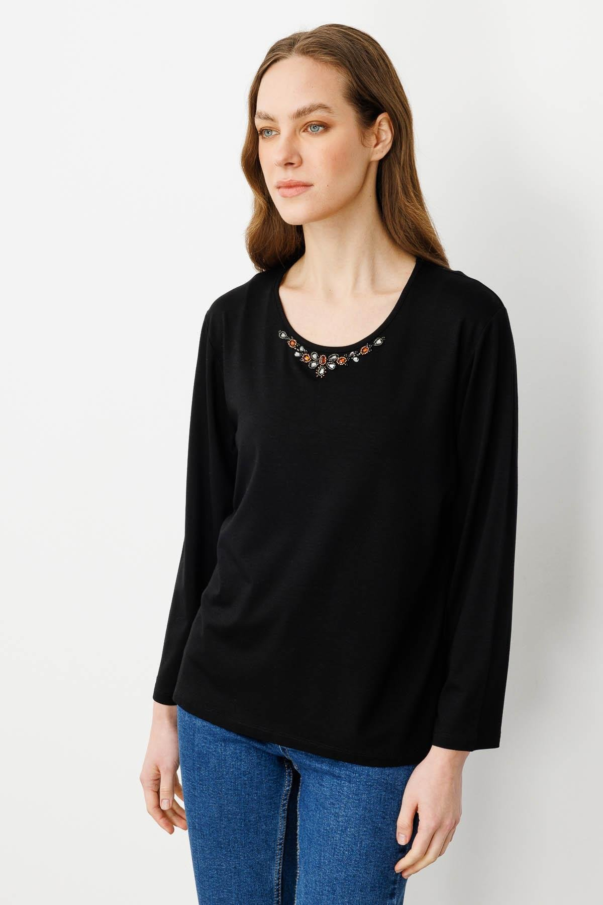 Kadın Sıfır Yaka Boncuk İşlemeli Penye Bluz SiyahDesen