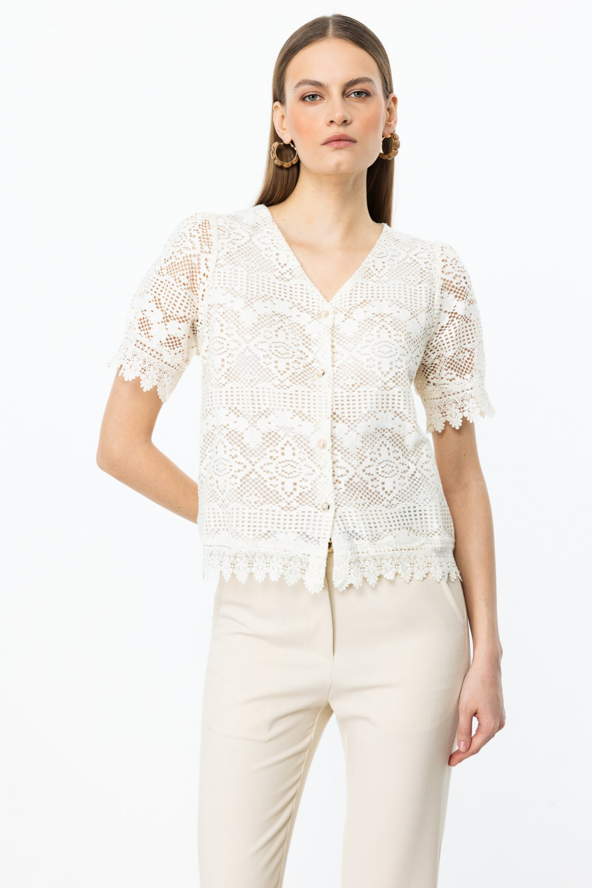 On Kadın V Yaka Kısa Kol Dantel Hırka - Minimalist Tarz