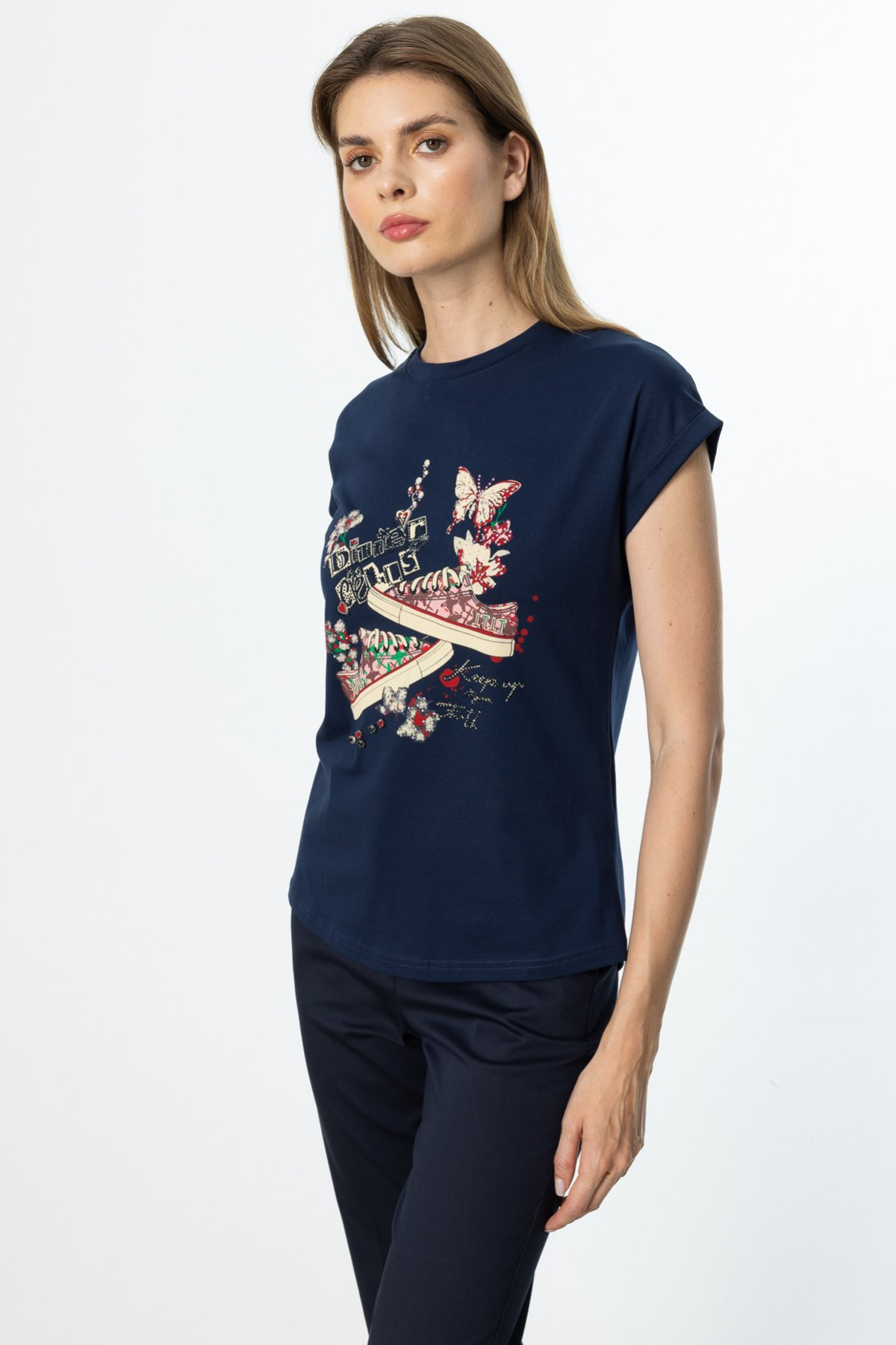 Ürün Özellikleri: Bisiklet yaka, kısa kol, taş işlemeli, baskılı