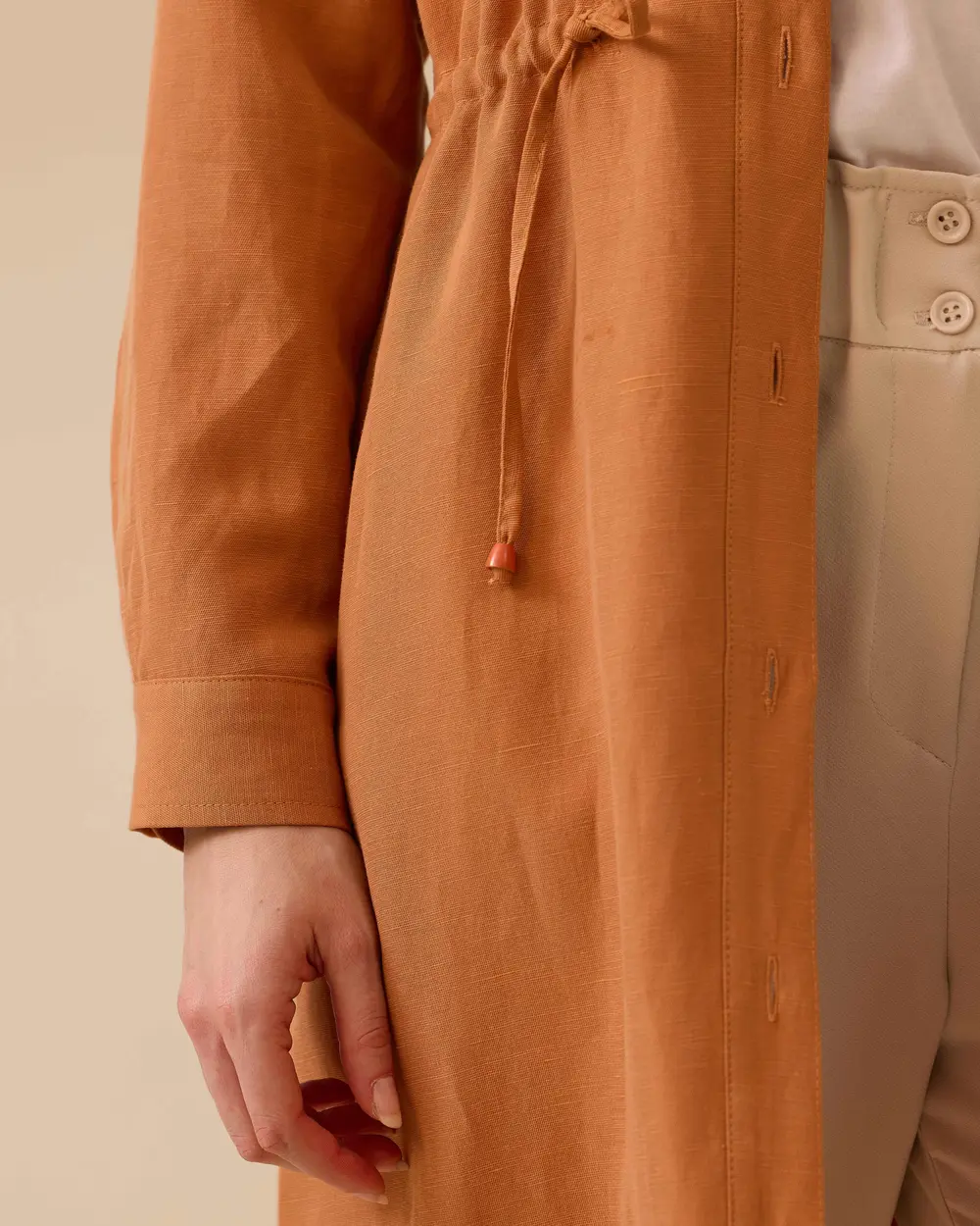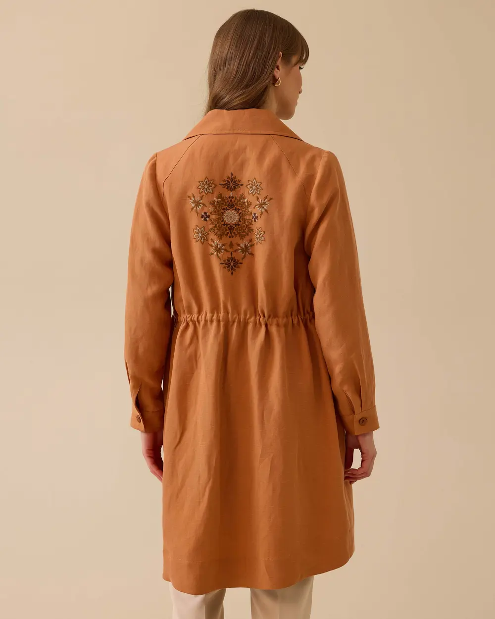 Nakış Detaylı Beli Büzgülü Kap, zarif nakış işlemeleri ve ayarlanabilir beliyle şık ve konforlu bir stil sunar.