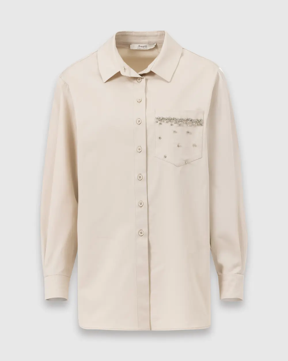 Taşlı Cep Detaylı Düğmeli Gömlek, şık ve dikkat çekici tasarımıyla her ortamda öne çıkmanızı sağlar. Göğüs hizasındaki taş detayı, zarif bir dokunuş katarken, farklı kombinler için ideal bir seçimdir.