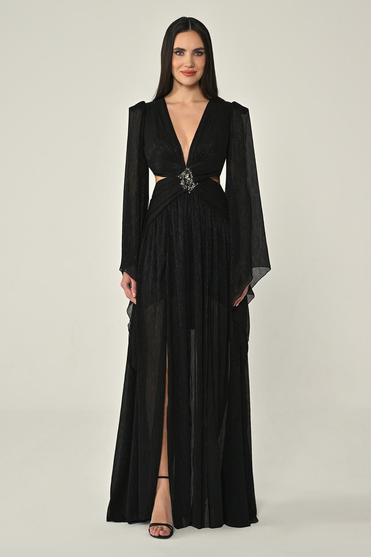 V Yaka Bel Sırt Dekolteli Önü Broşlu Şifon Uzun Elbise Abiye Alfa Beta