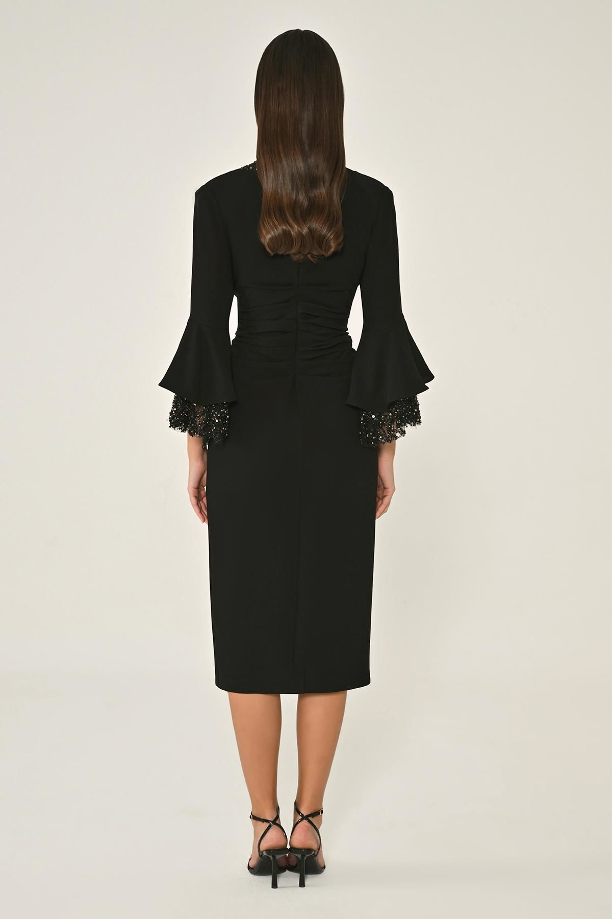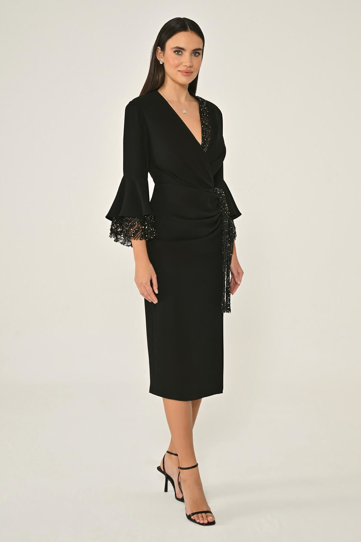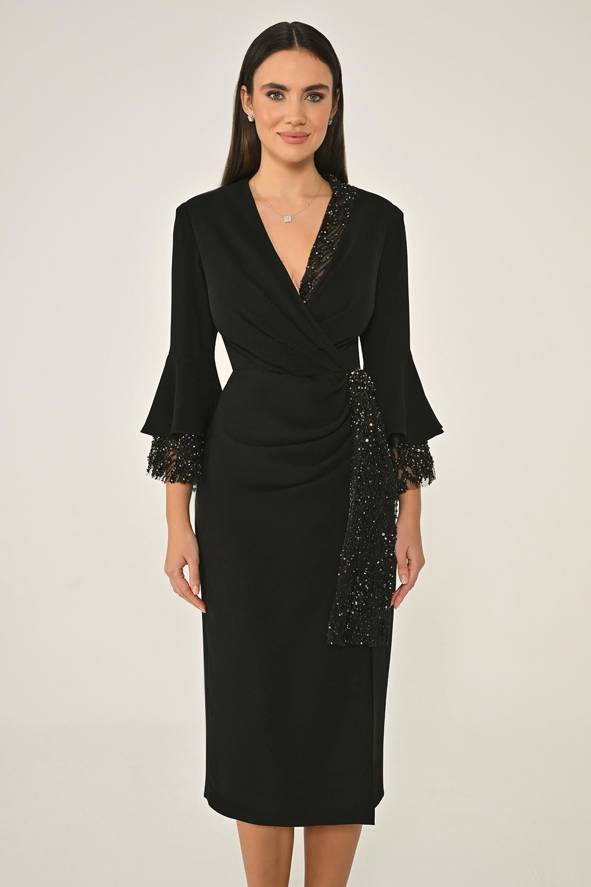 V Yaka Bocuklu Kumaş Detaylı Krep Midi Abiye Elbise Alfa Beta
