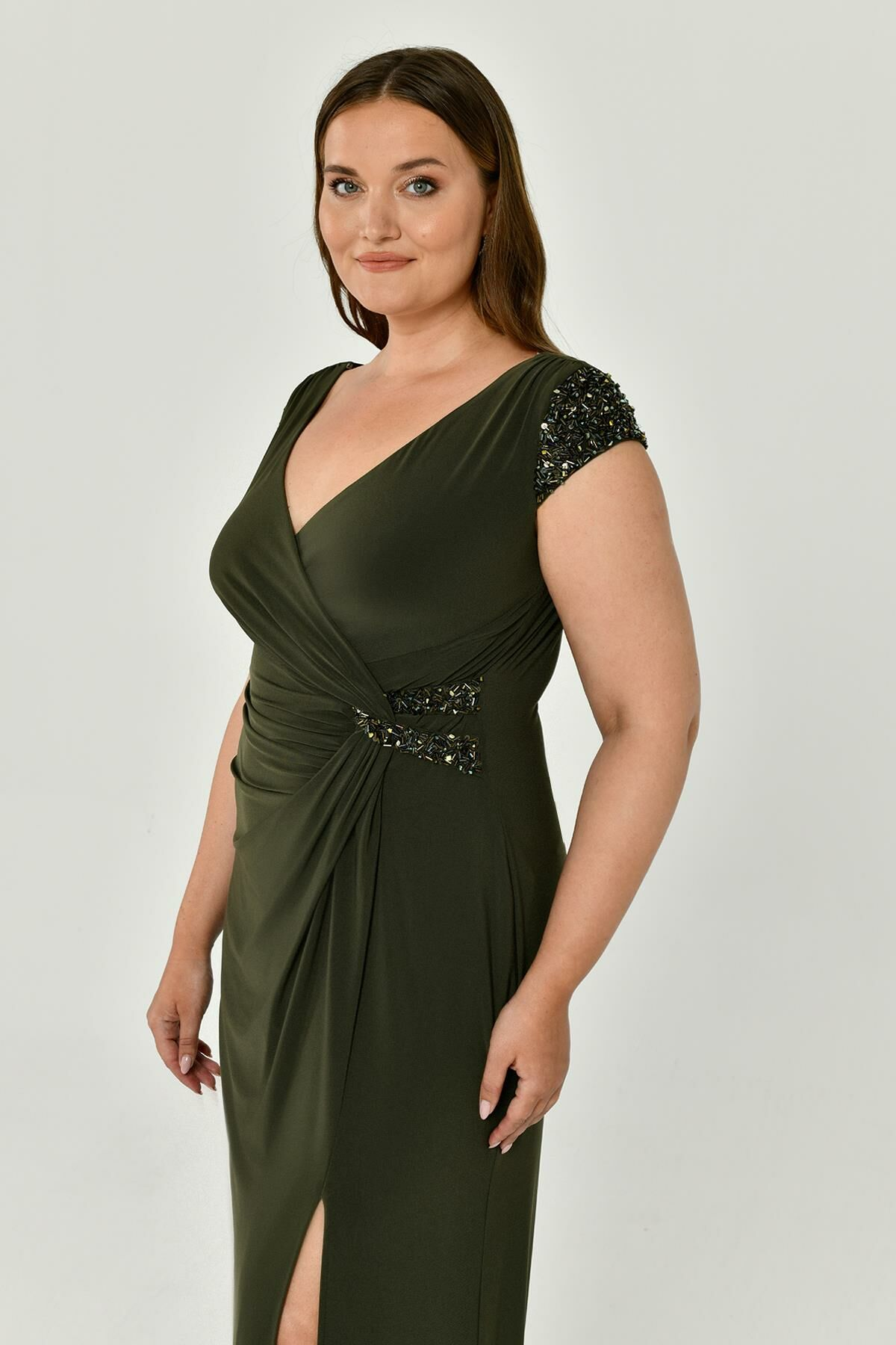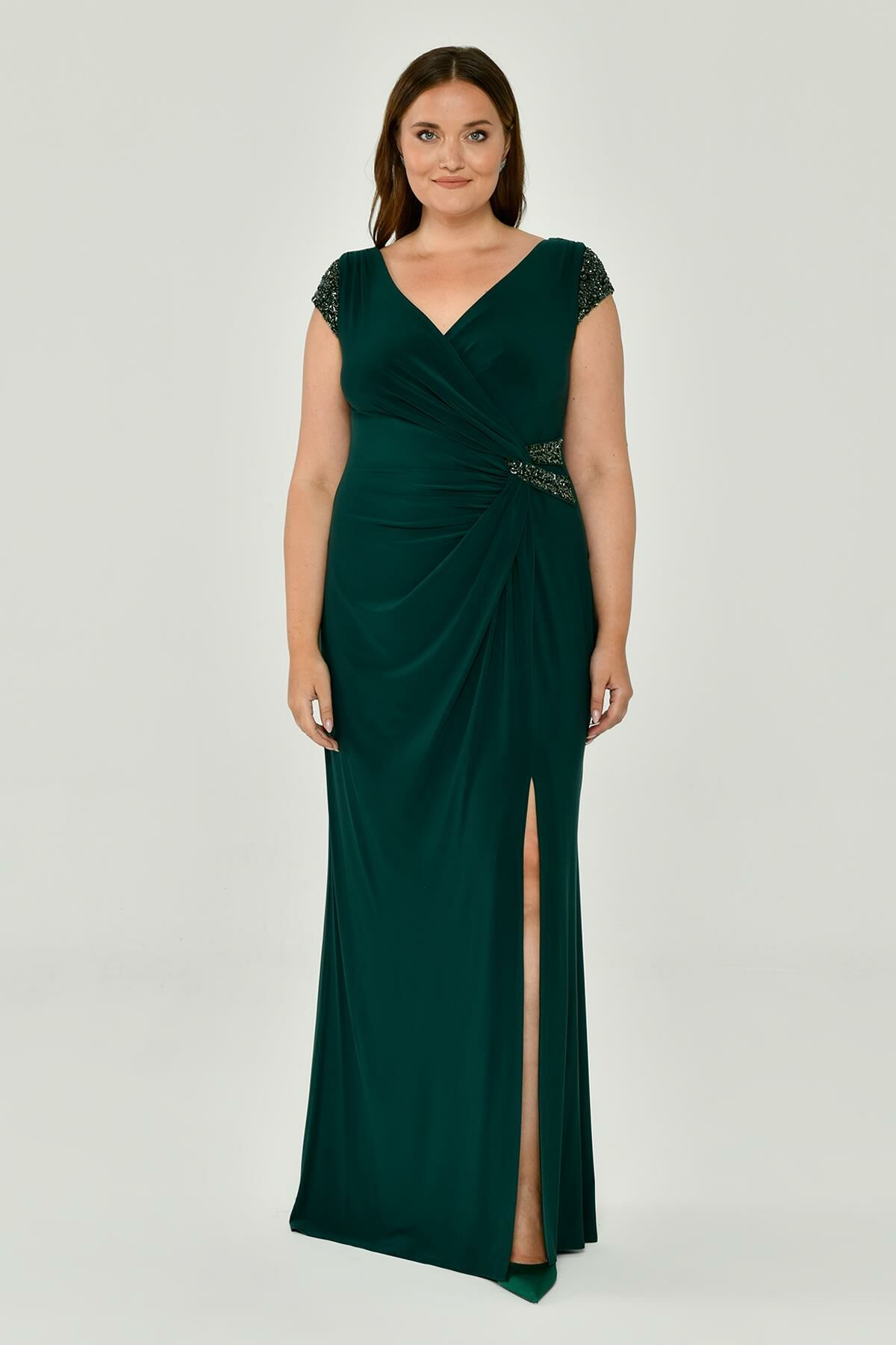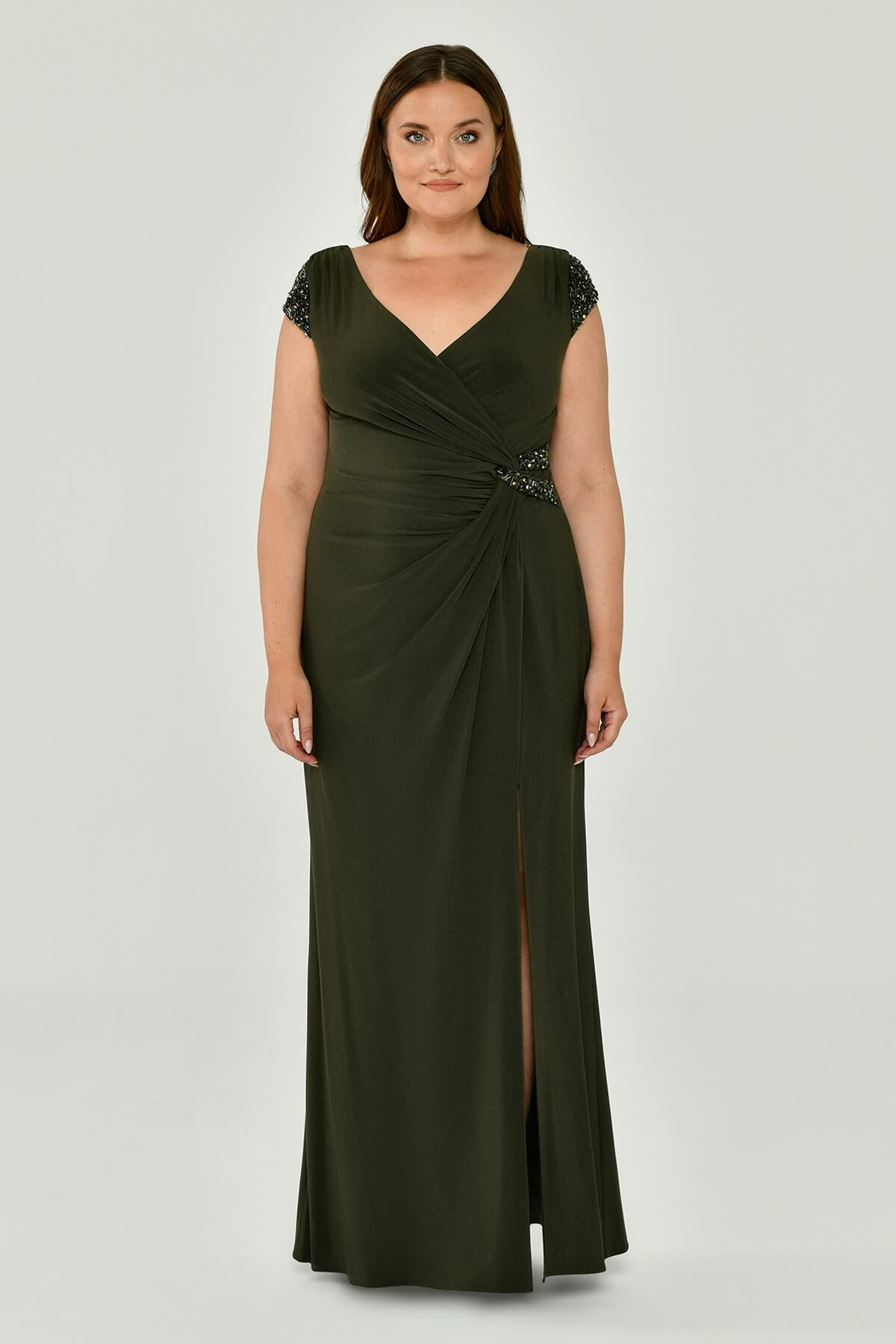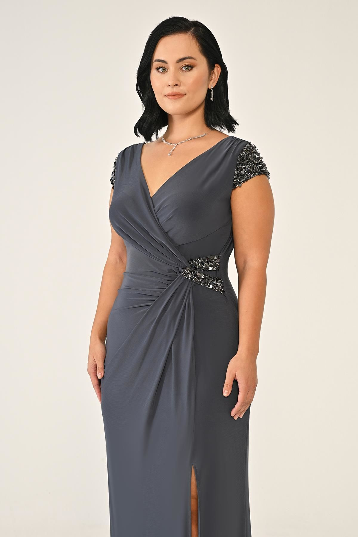 V Yaka Kısa Kollu Aksesuarlı Yırtmaçlı Uzun Abiye Elbise Alfabeta