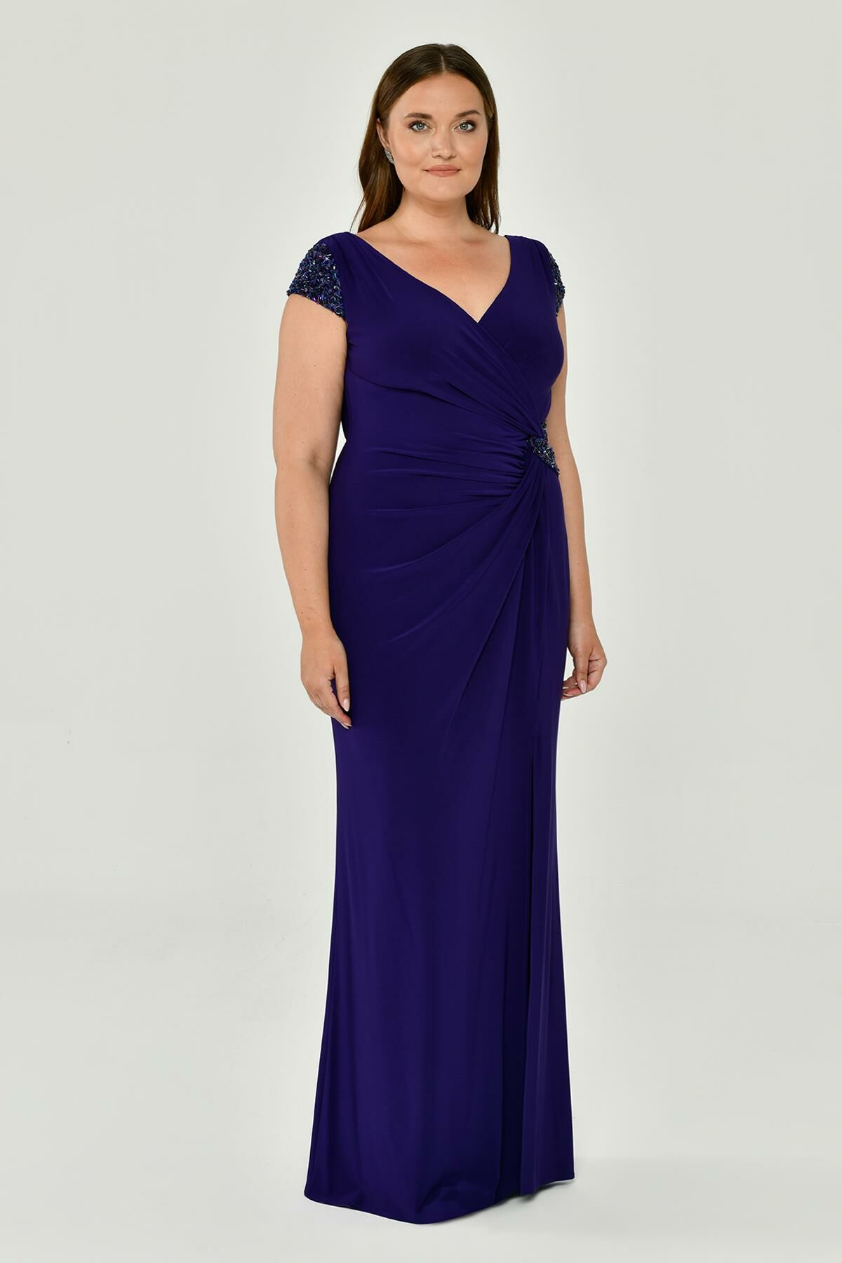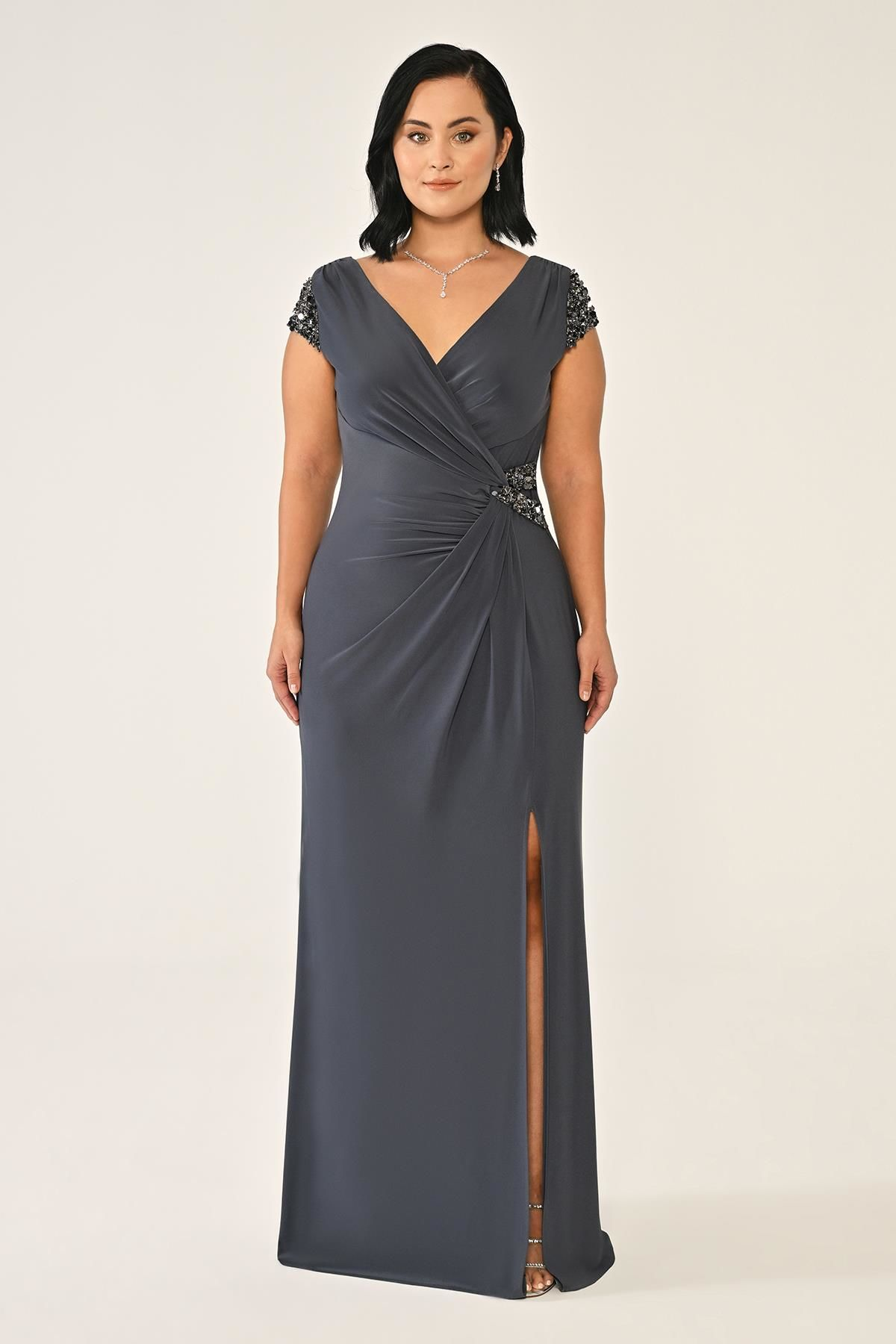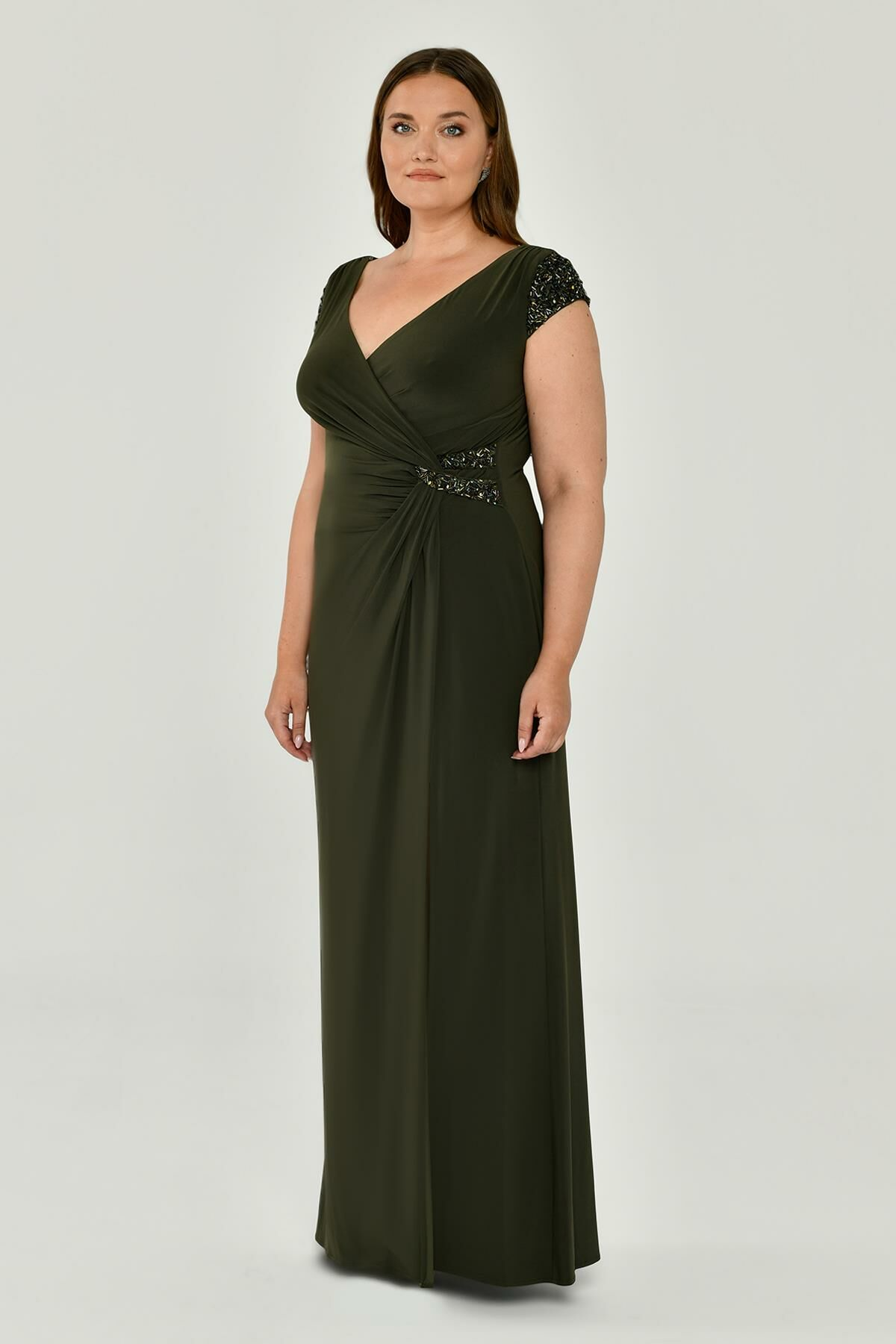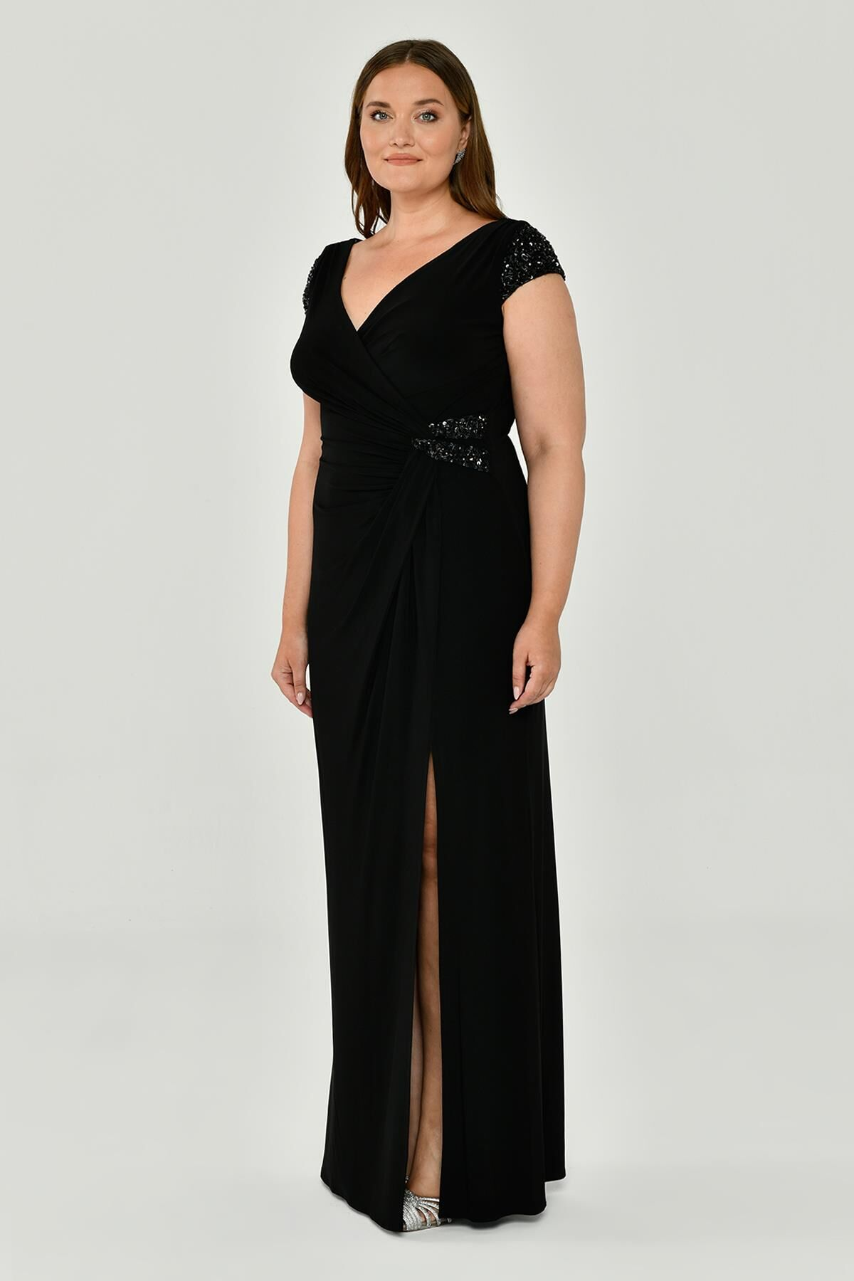 V Yaka Kısa Kollu Aksesuarlı Yırtmaçlı Uzun Abiye Elbise Alfabeta