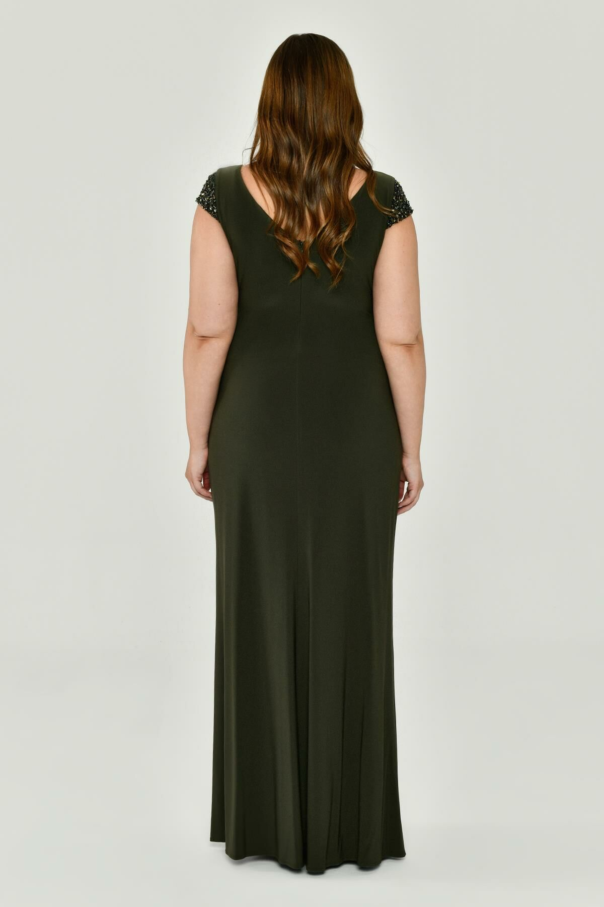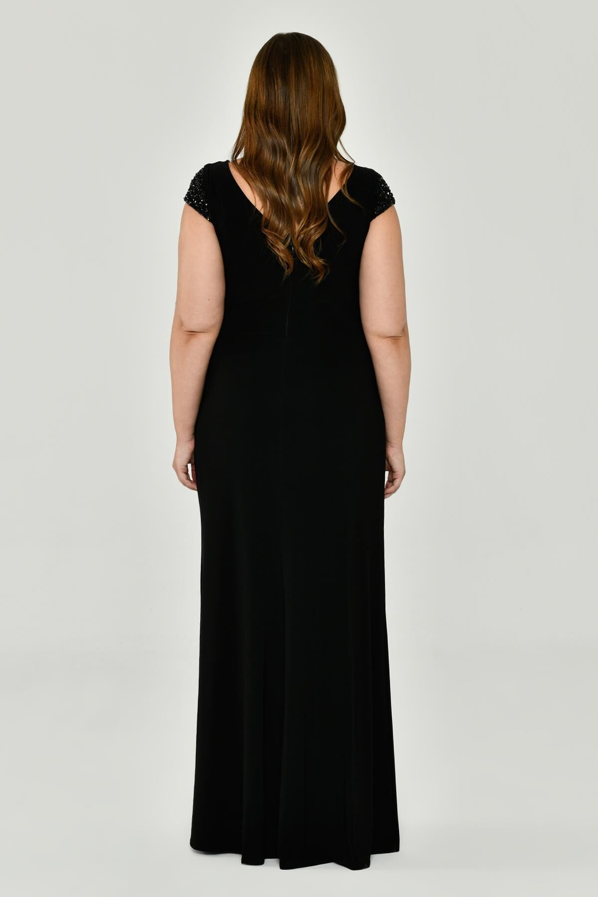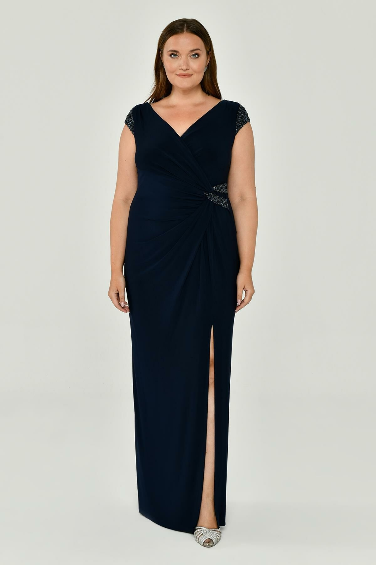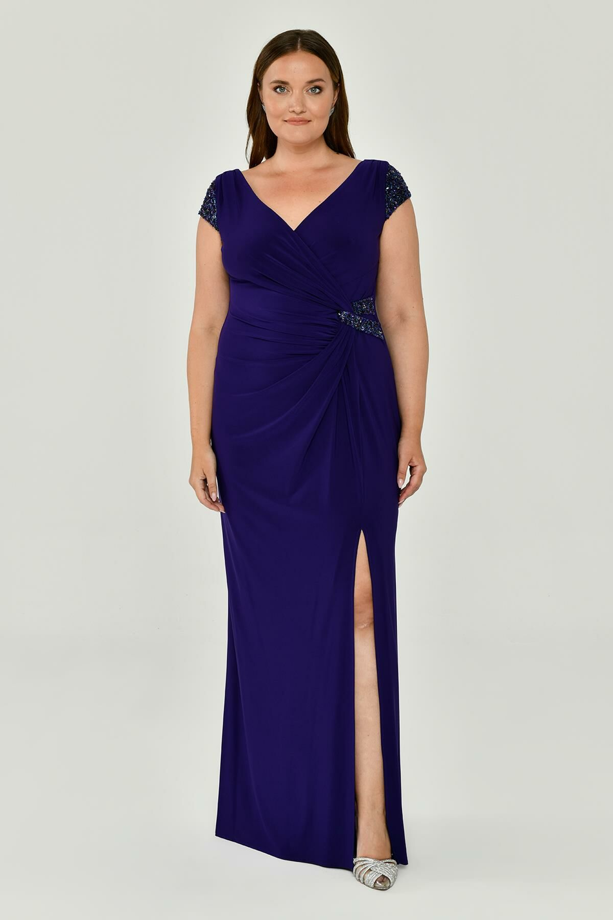 V Yaka Kısa Kollu Aksesuarlı Yırtmaçlı Uzun Abiye Elbise Alfabeta