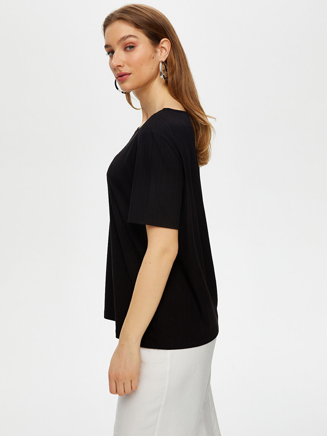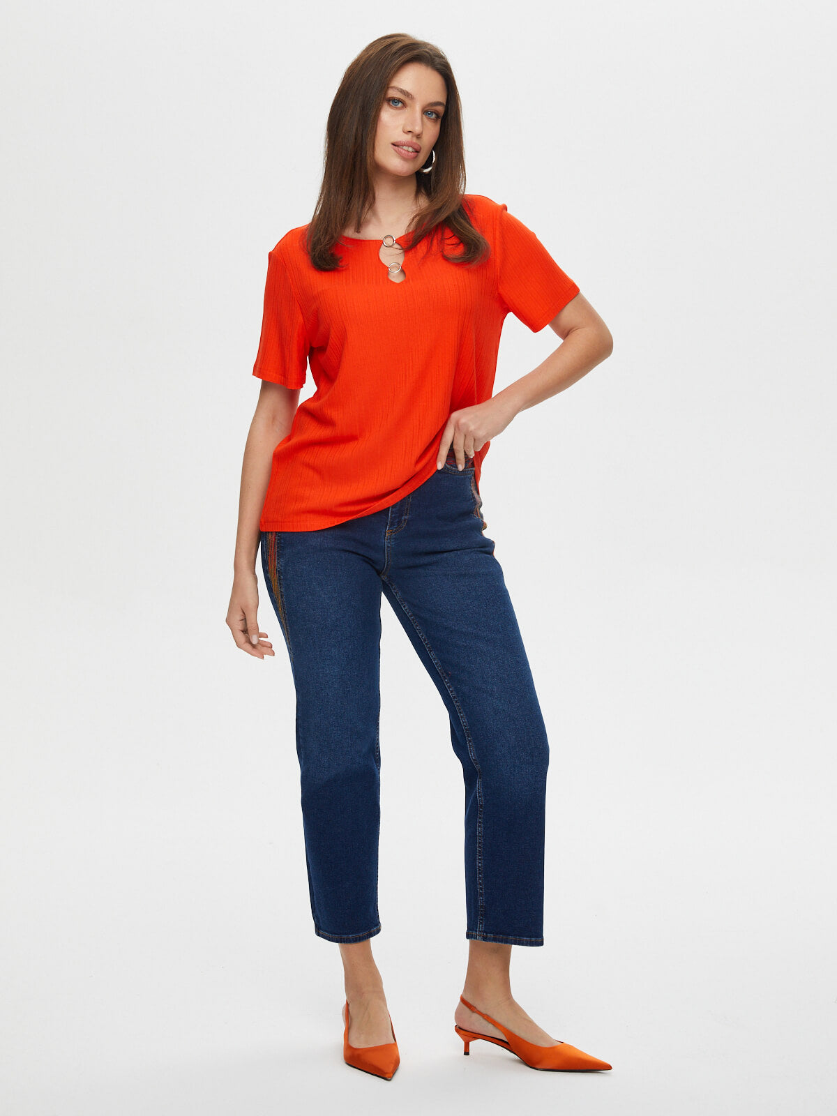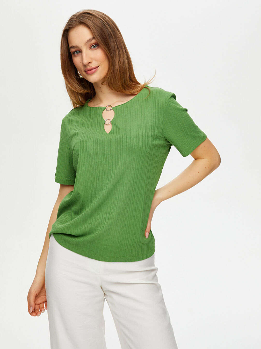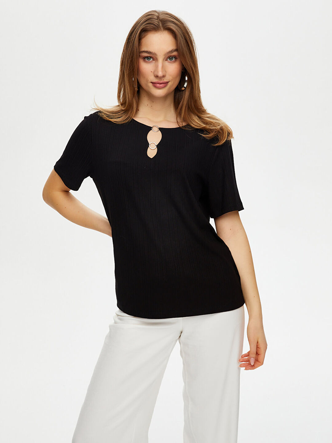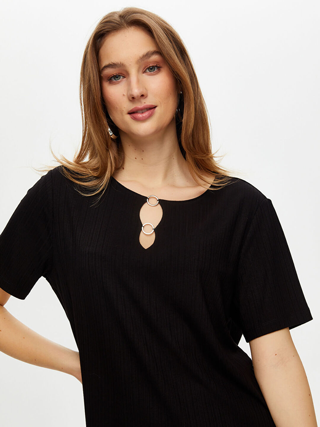 Yakası Metal Halka Detaylı Kısa Kol Örme Bluz Faik Sönmez